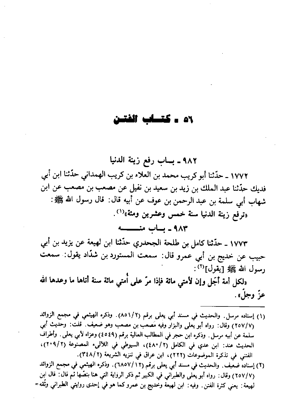 1772 - حَدَّثَنَا أَبُو كُرَيْبٍ مُحَمَّدُ بْنُ الْعَلاءِ بْنِ كُرَيْبٍ الْهَمَدَانِيُّ، حَدَّثَنَا ابْنُ أَبِي فُدَيْكٍ، حَدَّثَنَا عَبْدُ الْمَلِكِ بْنُ زَيْدِ بْنِ سَعِيدِ بْنِ نُفَيْلٍ، عَنْ مُصْعَبِ بْنِ مُصْعَبٍ، عَنِ ابْنِ شِهَابٍ عَنْ أَبِي سَلَمَةَ بْنِ عَبْدِ الرَّحْمَنِ بْنِ عَوْفٍ، عَنْ أَبِيهِ قَالَ: قَالَ رَسُولُ اللَّهِ صَلَّى اللَّهُ عَلَيْهِ وَسَلَّمَ: «تُرْفَعُ زِينَةُ الدُّنْيَا سَنَةَ خَمْسٍ وَعِشْرِينَ وَمِائَةٍ» .