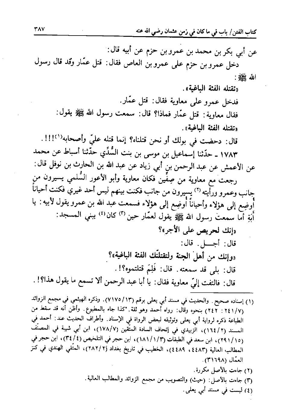 1783 - حَدَّثَنَا إِسْمَاعِيلُ بْنُ مُوسَى بْنِ بِنْتِ السُّدِّيِّ، حَدَّثَنَا أَسْبَاطٌ، عَنْ مُحَمَّدٍ، عَنِ الأَعْمَشِ، عَنْ عَبْدِ الرَّحْمَنِ بْنِ أَبِي زِيَادٍ، عَنْ عَبْدِ اللَّهِ بْنِ الْحَارِثِ بْنِ نَوْفَلٍ قَالَ: رَجَعْتُ مَعَ مُعَاوِيَةَ مِنْ صِفِّينَ فَكَانَ مُعَاوِيَةُ وَأَبُو الأَعْوَرِ السُّلَمِيُّ يَسِيرُونَ مِنْ جَانِبٍ وَعَمْرٌو ورأيته يَسِيرُونَ مِنْ جَانِبٍ، فَكُنْتُ بَيْنَهُمْ لَيْسَ أَحَدٌ غَيْرِي فَكُنْتُ أَحْيَانًا أُوضَعُ إِلَى هَؤُلاءِ وَأَحْيَانًا أُوضَعُ إِلَى هَؤُلاءِ، فَسَمِعْتُ عَبْدَ اللَّهِ بْنَ عَمْرٍو يَقُولُ لأَبِيهِ: يَا أَبَةَ أَمَا سَمِعْتَ رَسُولَ اللَّهِ صَلَّى اللَّهُ عَلَيْهِ وَسَلَّمَ يَقُولُ لِعَمَّارٍ حِينَ كَانَ يَبْنِي الْمَسْجِدَ: «إِنَّكَ لَحَرِيصٌ عَلَى الأَجْرِ» ؟ قَالَ: أَجَلْ.