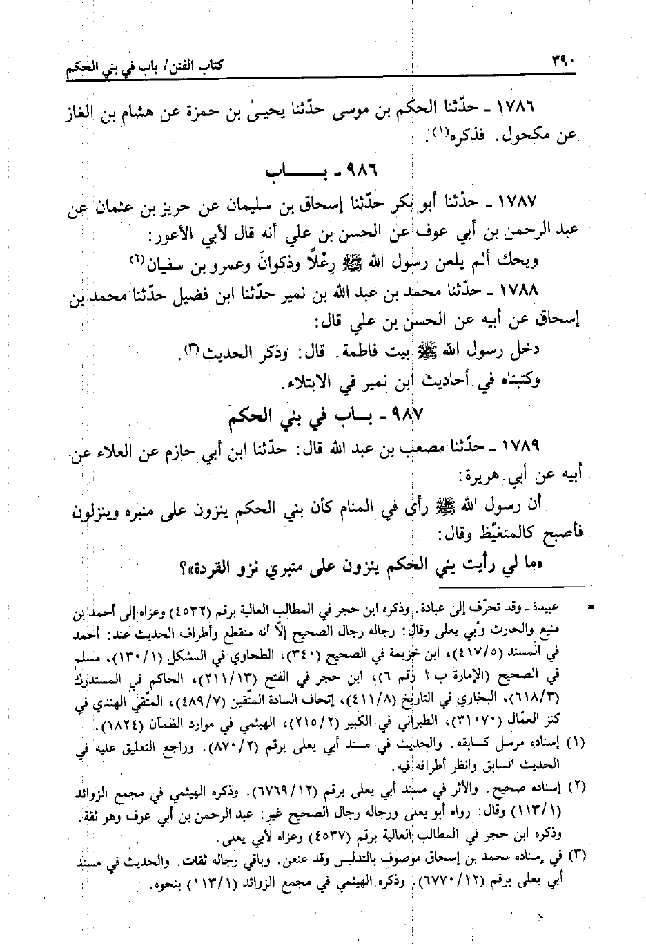 1789 - حَدَّثَنَا مُصْعَبُ بْنُ عَبْدِ اللَّهِ قَالَ: حَدَّثَنَا ابْنُ أَبِي حَازِمٍ، عَنِ الْعَلاءِ، عَنْ أَبِيهِ، عَنْ أَبِي هُرَيْرَةَ: أَنَّ رَسُولَ اللَّهِ صَلَّى اللَّهُ عَلَيْهِ وَسَلَّمَ رَأَى فِي الْمَنَامِ كَأَنَّ بَنِي الْحَكَمِ يَنْزُونَ عَلَى مِنْبَرِهِ وَيَنْزِلُونَ فَأَصْبَحَ كَالْمُتَغَيِّظِ وَقَالَ: «مَا لِي رَأَيْتُ بَنِي الْحَكَمِ يَنْزُونَ عَلَى مِنْبَرِي نَزْوَ الْقِرَدَةِ» ؟
