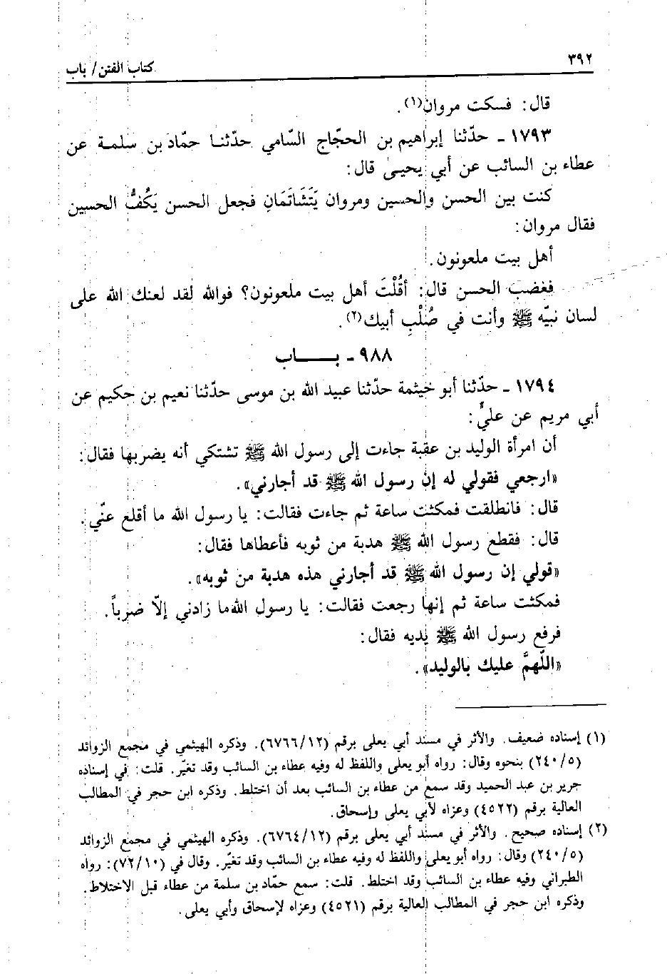 1793 - حَدَّثَنَا إِبْرَاهِيمُ بْنُ الْحَجَّاجِ السَّامِيُّ، حَدَّثَنَا حَمَّادُ بْنُ سَلَمَةَ، عَنْ عَطَاءِ بْنِ السَّائِبِ، عَنْ أَبِي يَحْيَى قَالَ: كُنْتُ بَيْنَ الْحَسَنِ وَالْحُسَيْنِ وَمَرْوَانَ يَتَشَاتَمَانِ فَجَعَلَ الْحَسَنُ يَكُفُّ الْحُسَيْنَ فَقَالَ مَرْوَانُ: أَهْلُ بَيْتٍ مَلْعُونُونَ.