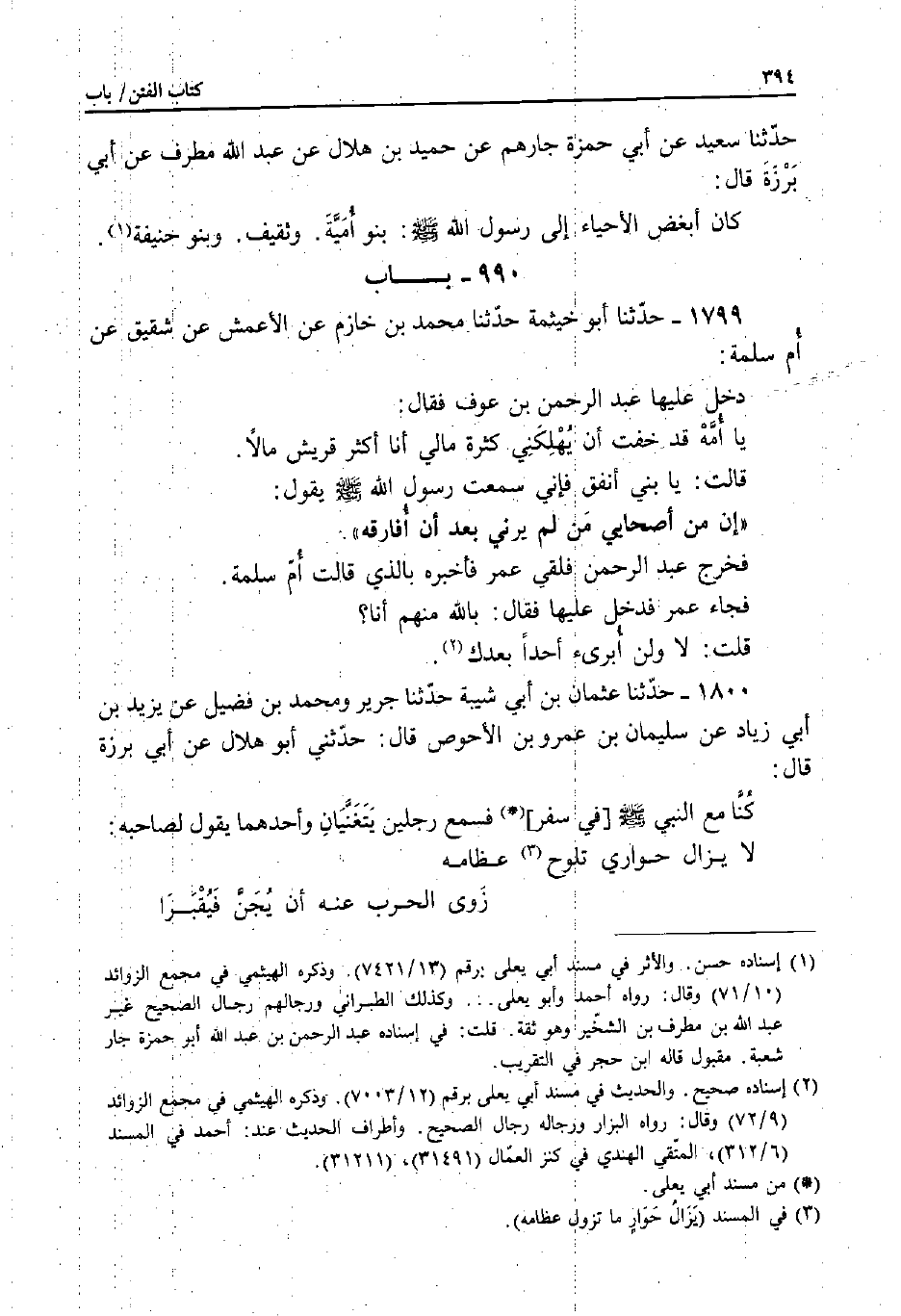 1800 - حَدَّثَنَا عُثْمَانُ بْنُ أَبِي شَيْبَةَ، حَدَّثَنَا جَرِيرٌ وَمُحَمَّدُ بْنُ فُضَيْلٍ، عَنْ يَزِيدَ بْنِ أَبِي زِيَادٍ، عَنْ سُلَيْمَانَ بْنِ عَمْرِو بْنِ الأَحْوَصِ قَالَ: حَدَّثَنِي أَبُو هِلالٍ، عَنْ أَبِي بَرْزَةَ قَالَ: كُنَّا مَعَ النَّبِيِّ صَلَّى اللَّهُ عَلَيْهِ وَسَلَّمَ فِي سَفَرٍ فَسَمِعَ رَجُلَيْنِ يَتَغَنَّيَانِ وَأَحَدُهُمَا يَقُولُ لِصَاحِبِهِ: