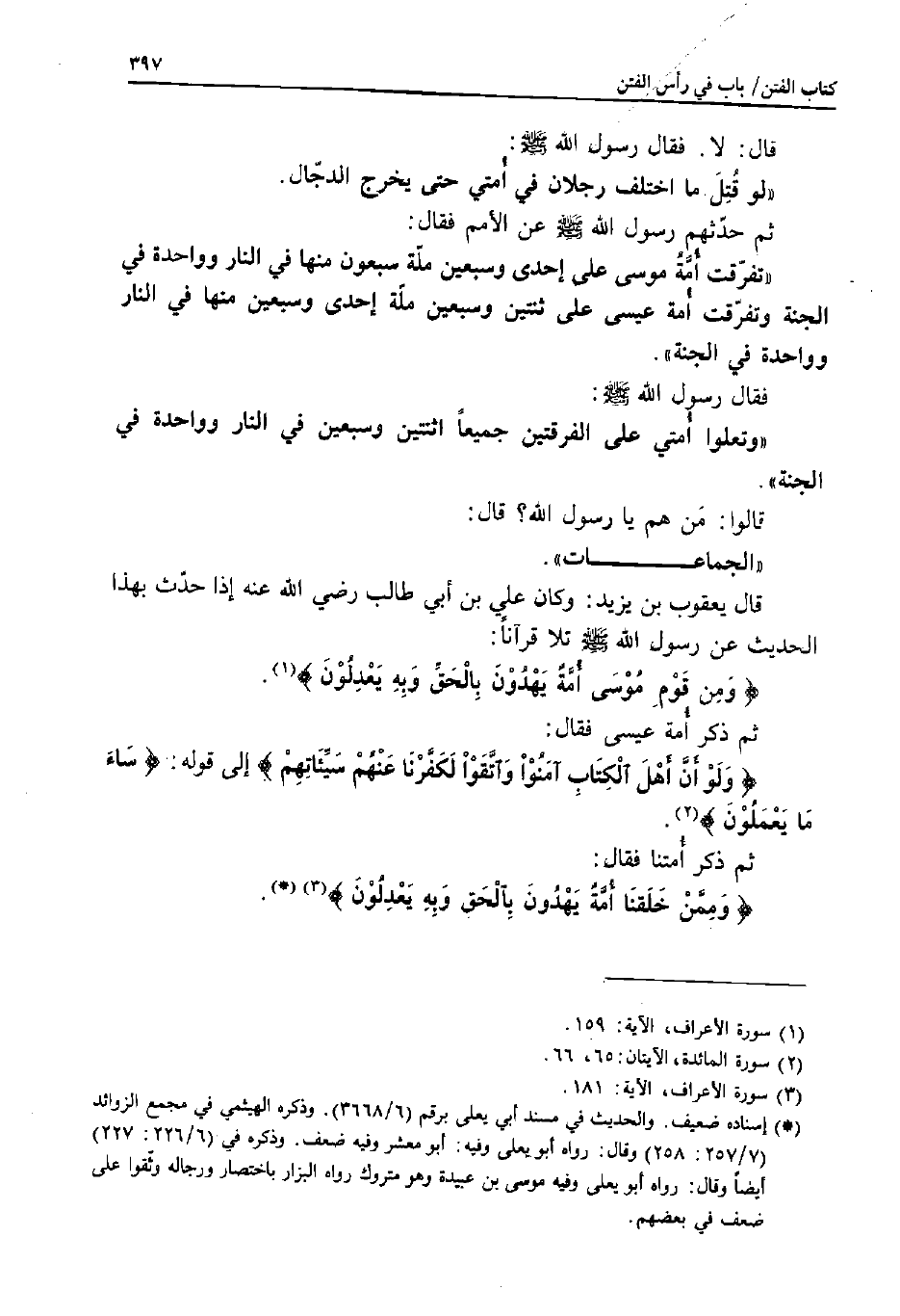 فَقَالَ رَسُولُ اللَّهِ صَلَّى اللَّهُ عَلَيْهِ وَسَلَّمَ: «وَتَعْلُو أُمَّتِي عَلَى الْفِرْقَتَيْنِ جَمِيعًا اثْنَتَانِ وَسَبْعُونَ فِي النَّارِ وَوَاحِدَةٌ فِي الْجَنَّةِ» .