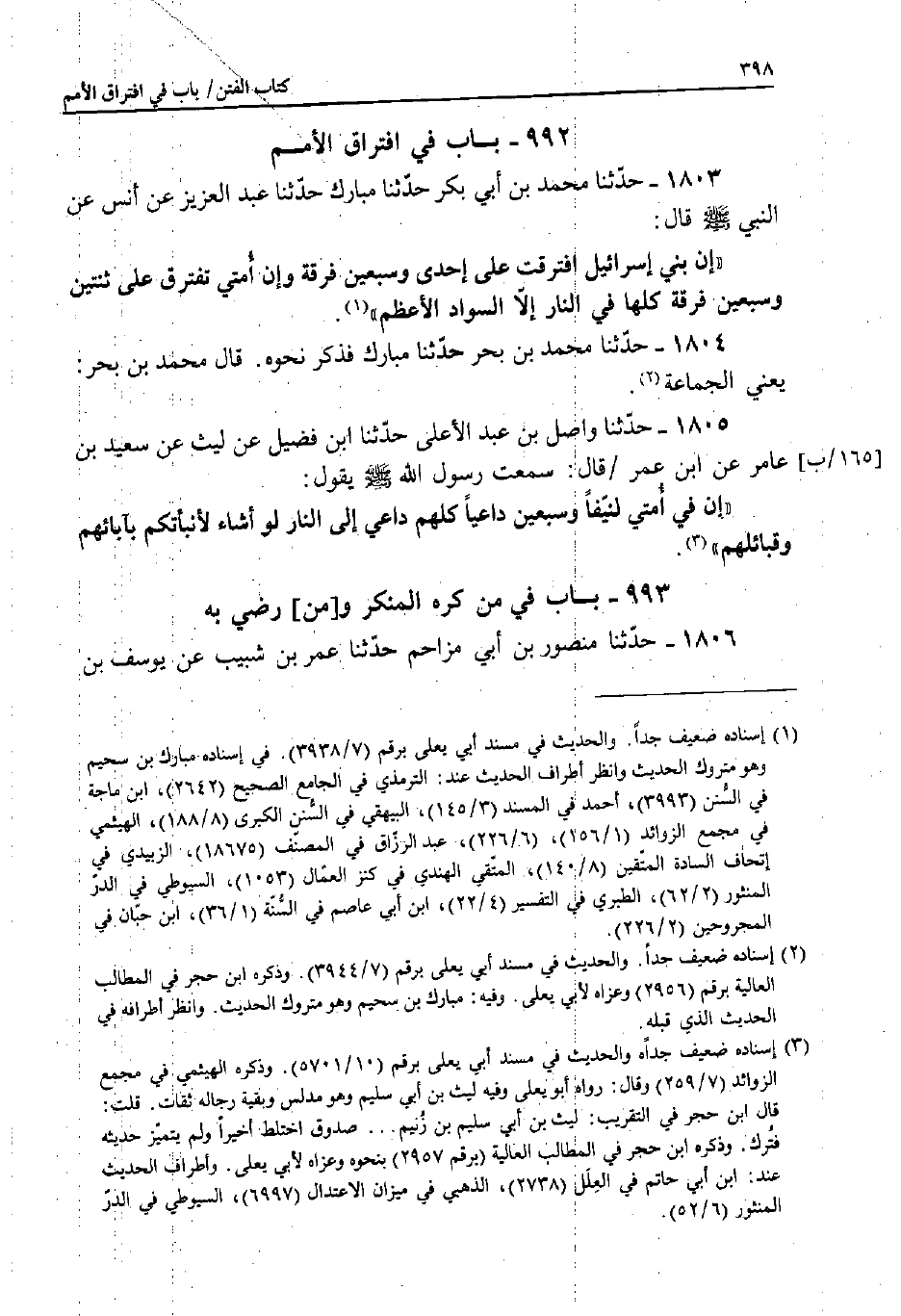 1803 - حَدَّثَنَا مُحَمَّدُ بْنُ أَبِي بَكْرٍ، حَدَّثَنَا مُبَارَكٌ، حَدَّثَنَا عَبْدُ الْعَزِيزِ، عَنْ أَنَسٍ، عَنِ النَّبِيِّ صَلَّى اللَّهُ عَلَيْهِ وَسَلَّمَ قَالَ: «إِنَّ بَنِي إِسْرَائِيلَ افْتَرَقَتْ عَلَى إِحْدَى وَسَبْعِينَ فِرْقَةً، وَإِنَّ أُمَّتِي تَفْتَرِقُ عَلَى ثِنْتَيْنِ وَسَبْعِينَ فِرْقَةً كُلُّهَا فِي النَّارِ إِلا السَّوَادَ الأَعْظَمَ» .