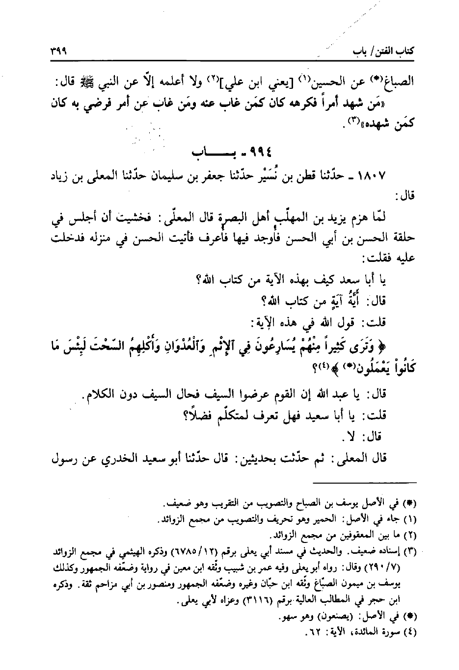 1807 - حَدَّثَنَا قَطَنُ بْنُ نُسَيْرٍ، حَدَّثَنَا جَعْفَرُ بْنُ سُلَيْمَانَ، حَدَّثَنَا الْمُعَلَّى بْنُ زِيَادٍ قَالَ: لَمَّا هَزَمَ يَزِيدُ بْنُ الْمُهَلَّبِ أَهْلَ الْبَصْرَةِ قَالَ الْمُعَلَّى: فَخَشِيتُ أَنْ أَجْلِسَ فِي حَلْقَةِ الْحَسَنِ بْنِ أَبِي الْحَسَنِ فَأُوجَدُ فِيهَا فَأُعْرَفُ فَأَتَيْتُ الْحَسَنَ فِي مَنْزِلِهِ فَدَخَلْتُ عَلَيْهِ فَقُلْتُ: يَا أَبَا سَعْدٍ، كَيْفَ بِهَذِهِ الآيَةِ مِنْ كِتَابِ اللَّهِ؟ قَالَ: أَيَّةُ آيَةٍ مِنْ كِتَابِ اللَّهِ؟ قُلْتُ: قَوْلُ اللَّهِ فِي هَذِهِ الآيَةِ: {وَتَرَى كَثِيرًا مِنْهُمْ يُسَارِعُونَ فِي الإِثْمِ وَالْعُدْوَانِ وَأَكْلِهِمُ السُّحْتَ لَبِئْسَ مَا كَانُوا يَعْمَلُونَ} [المائدة: 62] ؟ قَالَ: يَا عَبْدَ اللَّهِ إِنَّ الْقَوْمَ عَرَضُوا السَّيْفَ فَحَالَ السَّيْفُ دُونَ الْكَلامِ.