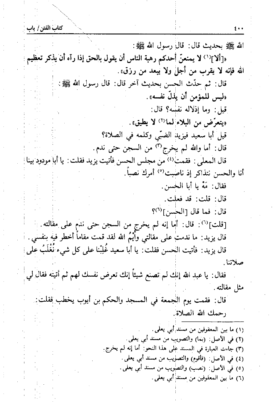 قَالَ: ثُمَّ حَدَّثَ الْحَسَنُ بِحَدِيثٍ آخَرَ قَالَ: قَالَ رَسُولُ اللَّهِ صَلَّى اللَّهُ عَلَيْهِ وَسَلَّمَ: «لَيْسَ لِلْمُؤْمِنِ أَنْ يُذِلَّ نَفْسَهُ» .