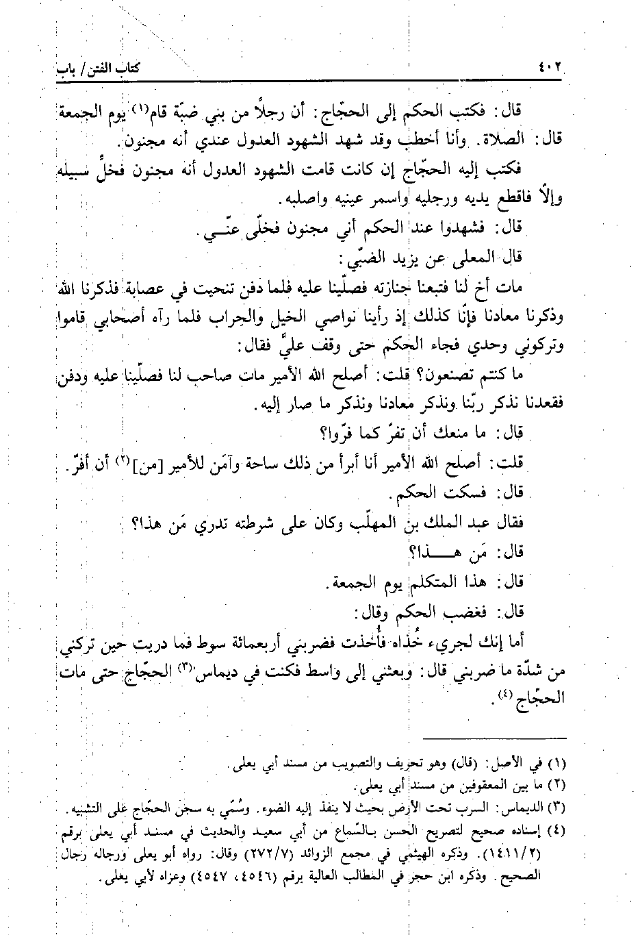 قَالَ: فَغَضِبَ الْحَكَمُ وَقَالَ: أَمَا إِنَّكَ لَجَرِيءٌ؛ خُذَاهُ فَضَرَبَنِي أَرْبَعَ مِائَةِ سَوْطٍ فَمَا دَرَيْتُ حِينَ تَرَكَنِي مِنْ شِدَّةِ مَا ضَرَبَنِي قَالَ: وَبَعَثَنِي إِلَى وَاسِطٍ فَكُنْتُ فِي دِيمَاسِ الْحَجَّاجِ حَتَّى مَاتَ الْحَجَّاجُ.