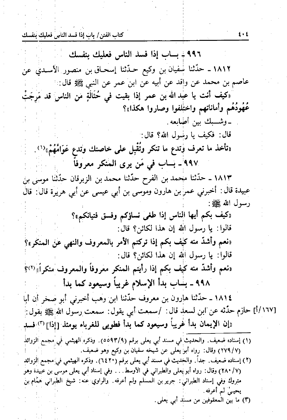 1813 - حَدَّثَنَا مُحَمَّدُ بْنُ الْفَرَحِ، حَدَّثَنَا مُحَمَّدُ بْنُ الزِّبْرِقَانِ، حَدَّثَنَا مُوسَى بْنُ عُبَيْدَةَ قَالَ: أَخْبَرَنِي عُمَرُ بْنُ هَارُونَ بْنِ أَبِي عِيسَى، عَنْ أَبِي هُرَيْرَةَ قَالَ: قَالَ رَسُولُ اللَّهِ صَلَّى اللَّهُ عَلَيْهِ وَسَلَّمَ: «كَيْفَ بِكُمْ أَيُّهَا النَّاسُ إِذَا طَغَى نِسَاؤُكُمْ وَفَسَقَ فِتْيَانُكُمْ» ؟ قَالُوا: يَا رَسُولَ اللَّهِ إِنَّ هَذَا لَكَائِنٌ؟ قَالَ: «نَعَمْ وَأَشَدُّ مِنْهُ كَيْفَ بِكُمْ إِذَا تَرَكْتُمُ الأَمْرَ بِالْمَعْرُوفِ وَالنَّهْيَ عَنِ الْمُنْكَرِ» ؟ قَالُوا: يَا رَسُولَ اللَّهِ إِنَّ هَذَا لَكَائِنٌ؟ قَالَ: «نَعَمْ وَأَشَدُّ مِنْهُ، كَيْفَ بِكُمْ إِذَا رَأَيْتُمُ الْمُنْكَرَ مَعْرُوفًا وَالْمَعْرُوفَ مُنْكَرًا» ؟