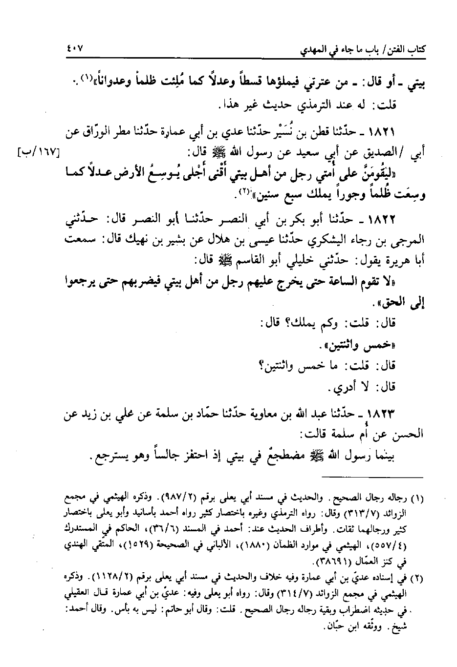 بَيْتِي - أَوْ قَالَ: - مِنْ عِتْرَتِي فَيَمْلَؤُهَا قِسْطًا وَعَدْلا كَمَا مُلِئَتْ ظُلْمًا وَعُدْوَانًا ".