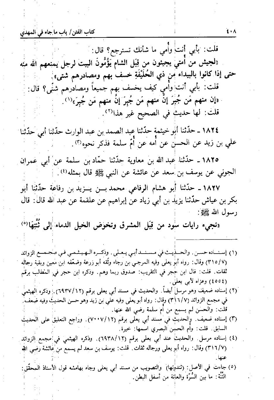 1826 - حَدَّثَنَا أَبُو هِشَامٍ الرِّفَاعِيُّ مُحَمَّدُ بْنُ يَزِيدَ بْنِ رِفَاعَةَ، حَدَّثَنَا أَبُو بَكْرِ بْنِ عَيَّاشٍ، حَدَّثَنَا يَزِيدُ بْنُ أَبِي زِيَادٍ، عَنْ إِبْرَاهِيمَ، عَنْ عَلْقَمَةَ، عَنْ عَبْدِ اللَّهِ قَالَ: قَالَ رَسُولُ اللَّهِ صَلَّى اللَّهُ عَلَيْهِ وَسَلَّمَ: «تَجِيءُ رَايَاتٌ سُودٌ مِنْ قِبَلِ الْمَشْرِقِ وَتَخُوضُ الْخَيْلُ الدِّمَاءَ إِلَى ثُنَّتِهَا