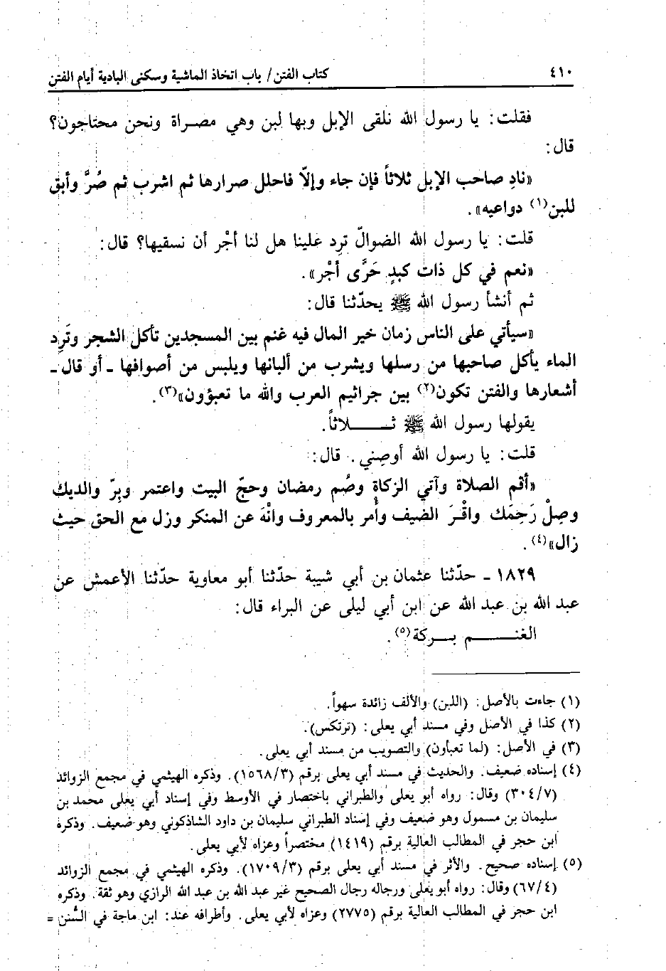 ثُمَّ أَنْشَأَ رَسُولُ اللَّهِ صَلَّى اللَّهُ عَلَيْهِ وَسَلَّمَ يحَدَّثَنَا قَالَ: «سَيَأْتِي عَلَى النَّاسِ زَمَانٌ خَيْرُ الْمَالِ فِيهِ غَنَمٌ بَيْنَ الْمَسْجِدَيْنِ تَأْكُلُ الشَّجَرَ وَتَرِدُ الْمَاءَ يَأْكُلُ صَاحِبُهَا مِنْ رِسْلِهَا وَيَشْرَبُ مِنْ أَلْبَانِهَا وَيَلْبَسُ مِنْ أَصْوَافِهَا - أَوْ قَالَ - أَشْعَارِهَا، وَالْفِتَنُ تَكُونُ بَيْنَ جَراثِيمِ الْعَرَبِ وَاللَّهِ مَا تَعْبَئُونَ» .
