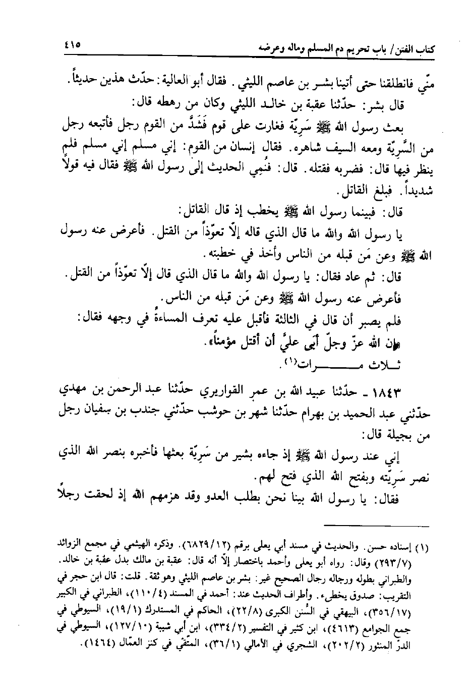 1843 - حَدَّثَنَا عُبَيْدُ اللَّهِ بْنُ عُمَرَ الْقَوَارِيرِيُّ، حَدَّثَنَا عَبْدُ الرَّحْمَنِ بْنُ مَهْدِيٍّ، حَدَّثَنَا عَبْدُ الْحَمِيدِ بْنُ بَهْرَامَ، حَدَّثَنَا شَهْرُ بْنُ حَوْشَبٍ، حَدَّثَنَا جُنْدُبُ بْنُ سُفْيَانَ رَجُلٌ مِنْ بَجِيلَةَ قَالَ: إِنِّي عِنْدَ رَسُولِ اللَّهِ صَلَّى اللَّهُ عَلَيْهِ وَسَلَّمَ إِذْ جَاءَهُ بَشِيرٌ مِنْ سَرِيَّةٍ بَعَثَهَا فَأَخْبَرَهُ بِنَصْرِ اللَّهِ الَّذِي نَصَرَ سَرِيَّتَهُ وَبِفَتْحِ اللَّهِ الَّذِي فَتَحَ لَهُمْ.