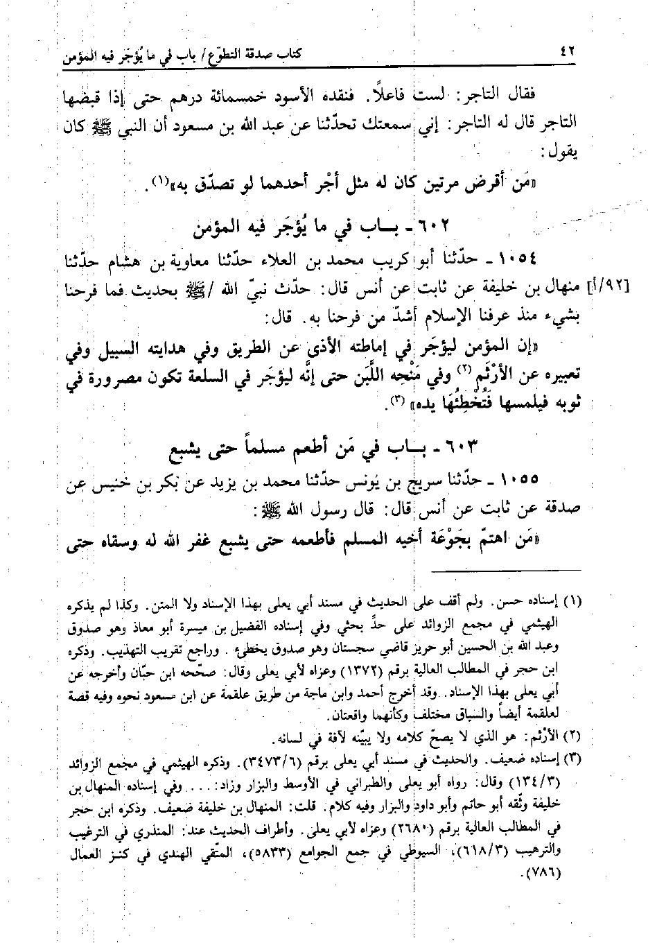 قَالَ: «إِنَّ الْمُؤْمِنَ لَيُؤْجَرُ فِي إِمَاطَتِهِ الأَذَى عَنِ الطَّرِيقِ، وَفِي هِدَايَتِهِ السَّبِيلِ وَفِي تَعْبِيرِهِ عَنِ الأرثم، وَفِي مَنْحِهِ اللَّبَنَ حَتَّى إِنَّهُ لَيُؤْجَرُ فِي السِّلْعَةِ تَكُونُ مَصْرُورَةً فِي ثَوْبٍ فَيَلْمِسُهَا فَتُخْطِئُهَا يَدُهُ» .