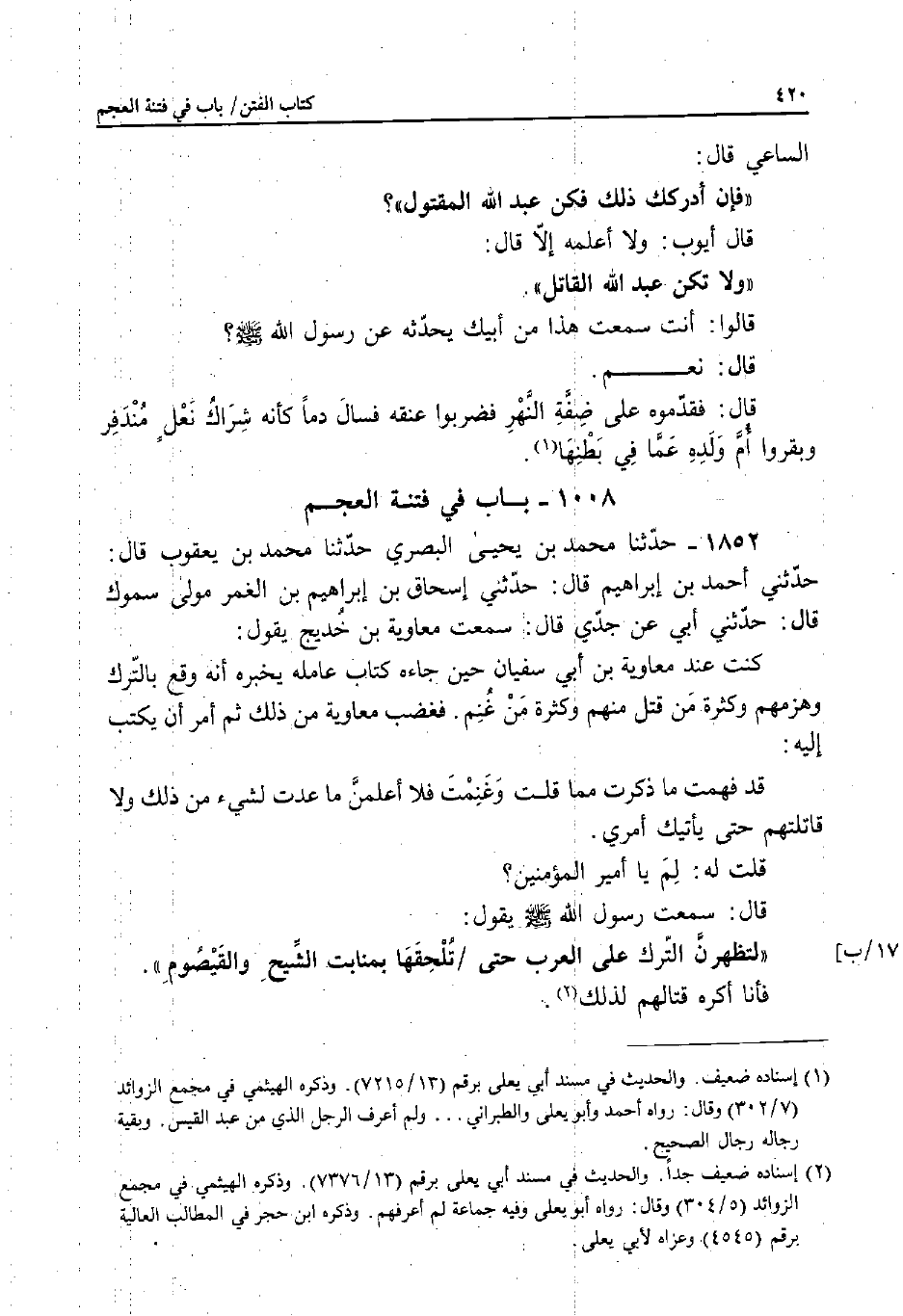 قُلْتُ لَهُ: لِمَ يَا أَمِيرَ الْمُؤْمِنِينَ؟ قَالَ: سَمِعْتُ رَسُولَ اللَّهِ صَلَّى اللَّهُ عَلَيْهِ وَسَلَّمَ يَقُولُ: «لَتَظْهَرَنَّ التُّرْكُ عَلَى الْعَرَبِ حَتَّى تَلْحَقَهَا بِمَنَابِتِ الشِّيحِ وَالْقَيْصُومِ» .