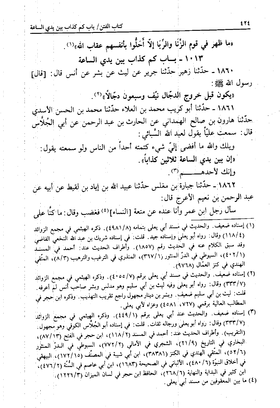 1861 - حَدَّثَنَا أَبُو كُرَيْبٍ مُحَمَّدُ بْنُ الْعَلاءِ، حَدَّثَنَا مُحَمَّدُ بْنُ الْحَسَنِ الأَسَدِيُّ، حَدَّثَنَا هَارُونُ بْنُ صَالِحٍ الْهَمَدَانِيُّ، عَنِ الْحَارِثِ بْنِ عَبْدِ الرَّحْمَنِ، عَنْ أَبِي الْجُلاسِ قَالَ: سَمِعْتُ عَلِيًّا يَقُولُ لِعَبْدِ اللَّهِ السَّبَائِيِّ: وَيْلُكَ وَاللَّهِ مَا أُفْضِيَ إِلَيَّ شَيْءٌ كَتَمْتُهُ أَحَدًا مِنَ النَّاسِ وَلَوْ سَمِعْتُهُ يَقُولُ: «إِنَّ بَيْنَ يَدَيِ السَّاعَةِ ثَلاثِينَ كَذَّابًا» .