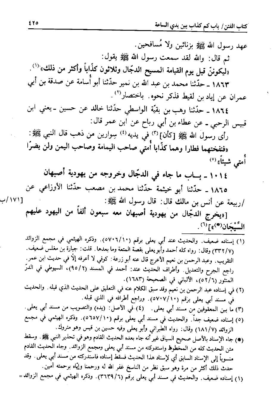 1865 - حَدَّثَنَا أَبُو خَيْثَمَةَ، حَدَّثَنَا مُحَمَّدُ بْنُ مُصْعَبٍ، حَدَّثَنَا الأَوْزَاعِيُّ، عَنْ رَبِيعَةَ، عَنْ أَنَسِ بْنِ مَالِكٍ قَالَ: قَالَ رَسُولُ اللَّهِ صَلَّى اللَّهُ عَلَيْهِ وَسَلَّمَ: «يَخْرُجُ الدَّجَّالُ مِنْ يَهُودِيَّةِ أَصْبَهَانَ مَعَهُ سَبْعُونَ أَلْفًا مِنَ الْيَهُودِ عَلَيْهِمُ السِّيجَانُ»