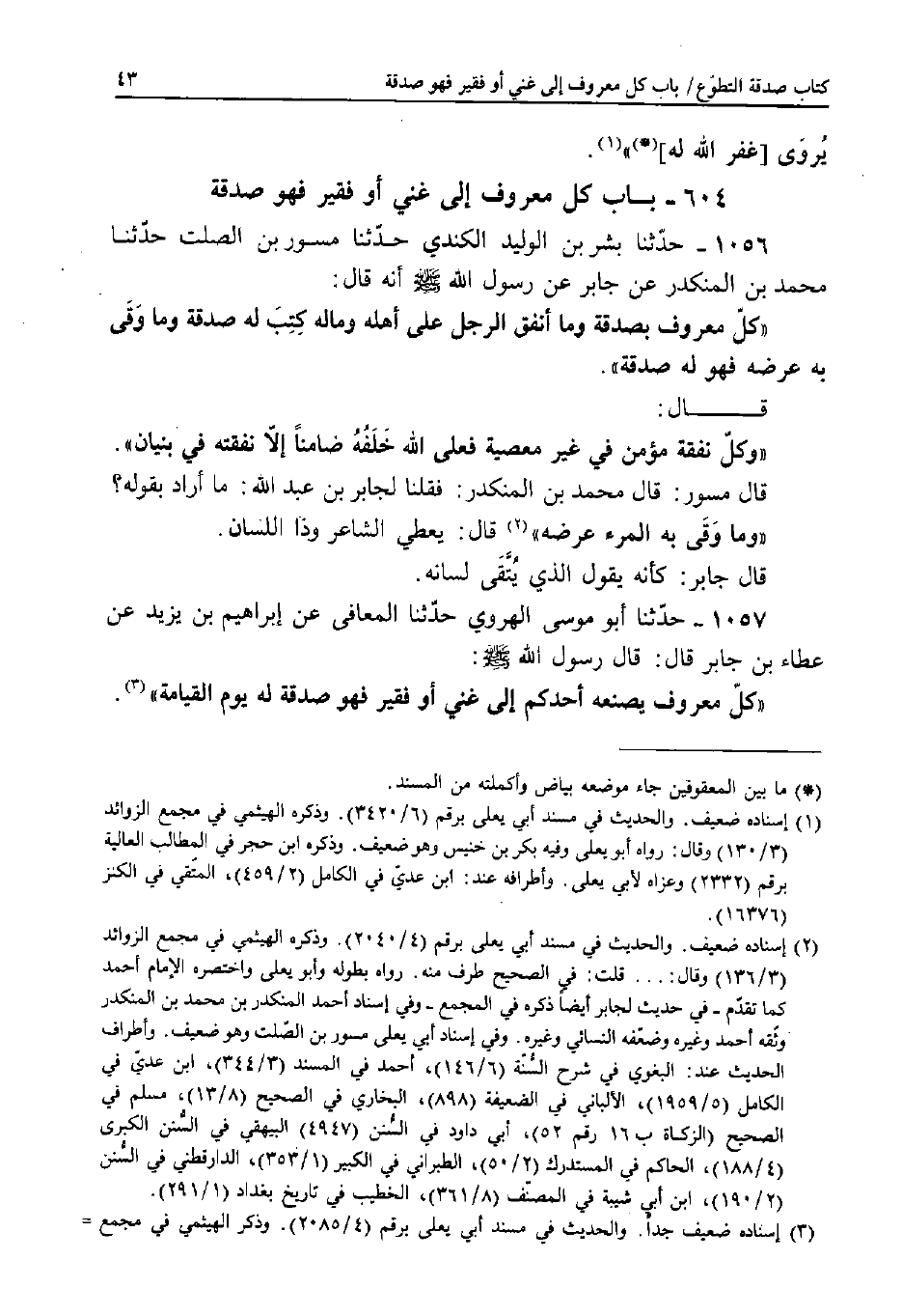 1057 - حَدَّثَنَا أَبُو مُوسَى الْهَرَوِيُّ، حَدَّثَنَا الْمُعَافَى، عَنْ إِبْرَاهِيمَ بْنِ يَزِيدَ، عَنْ عَطَاءِ عَنْ جَابِرٍ قَالَ: قَالَ رَسُولُ اللَّهِ صَلَّى اللَّهُ عَلَيْهِ وَسَلَّمَ: «كُلُّ مَعْرُوفٍ يَصْنَعُهُ أَحَدُكُمْ إِلَى غَنِيٍّ أَوْ فَقِيرٍ فَهُوَ صَدَقَةٌ لَهُ يَوْمَ الْقِيَامَةِ» .