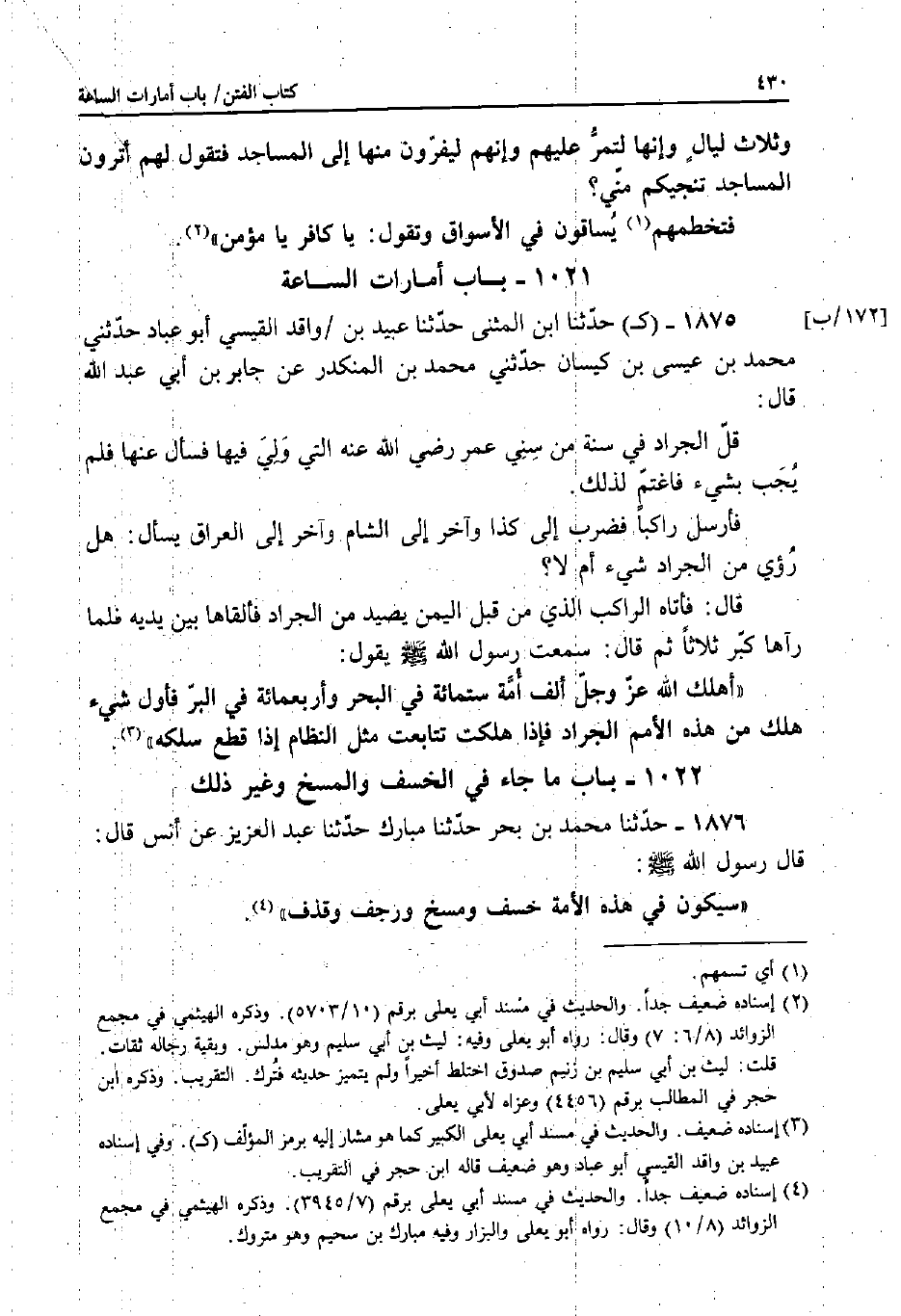 1875 - (كـ) حَدَّثَنَا ابْنُ الْمُثَنَّى، حَدَّثَنَا عُبَيْدُ بْنُ وَاقِدٍ الْقَيْسِيُّ أَبُو عَبَّادٍ، حَدَّثَنِي مُحَمَّدُ بْنُ عِيسَى بْنِ كَيْسَانَ، حَدَّثَنِي مُحَمَّدُ بْنُ الْمُنْكَدِرِ، عَنْ جَابِرِ بْنِ أَبِي عَبْدِ اللَّهِ قَالَ: قَلَّ الْجَرَادُ فِي سَنَةٍ مِنْ سِنِيِّ عُمَرَ رَضِيَ اللَّهُ عَنْهُ الَّتِي وَلِيَ فِيهَا فَسَأَلَ عَنْهَا فَلَمْ يُجَبْ بِشَيْءٍ فَاغْتَمَّ لِذَلِكَ.