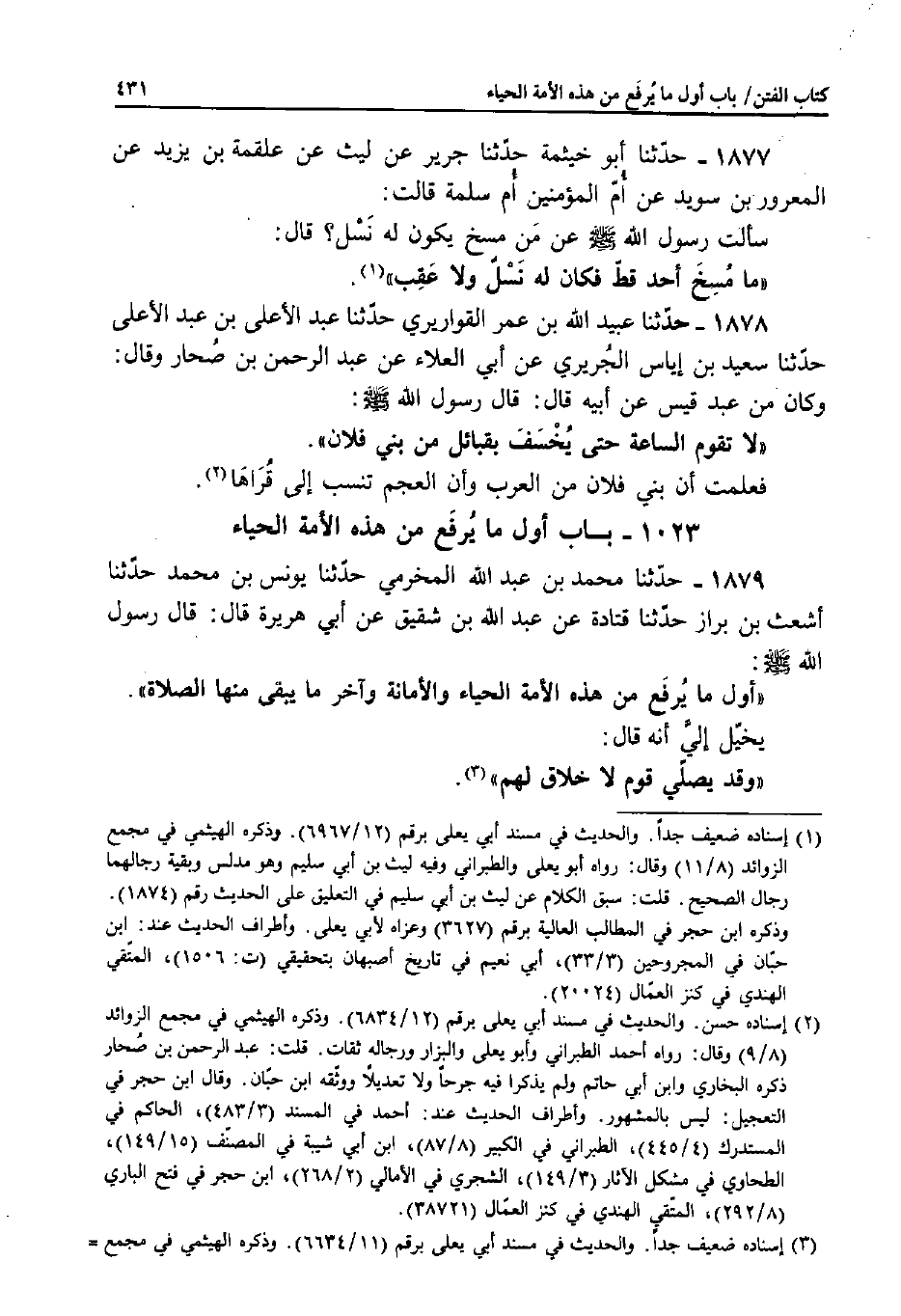 1879 - حَدَّثَنَا مُحَمَّدُ بْنُ عَبْدِ اللَّهِ الْمُخَرِّمِيُّ، حَدَّثَنَا يُونُسُ بْنُ مُحَمَّدٍ، حَدَّثَنَا أَشْعَثُ بْنُ بَرَازٍ، حَدَّثَنَا قَتَادَةُ، عَنْ عَبْدِ اللَّهِ بْنِ شَقِيقٍ، عَنْ أَبِي هُرَيْرَةَ قَالَ: قَالَ رَسُولُ اللَّهِ صَلَّى اللَّهُ عَلَيْهِ وَسَلَّمَ: «أَوَّلُ مَا يُرْفَعُ مِنْ هَذِهِ الأَمَّةِ الْحَيَاءُ وَالأَمَانَةُ وَآخِرُ مَا يَبْقَى مِنْهَا الصَّلاةُ» .