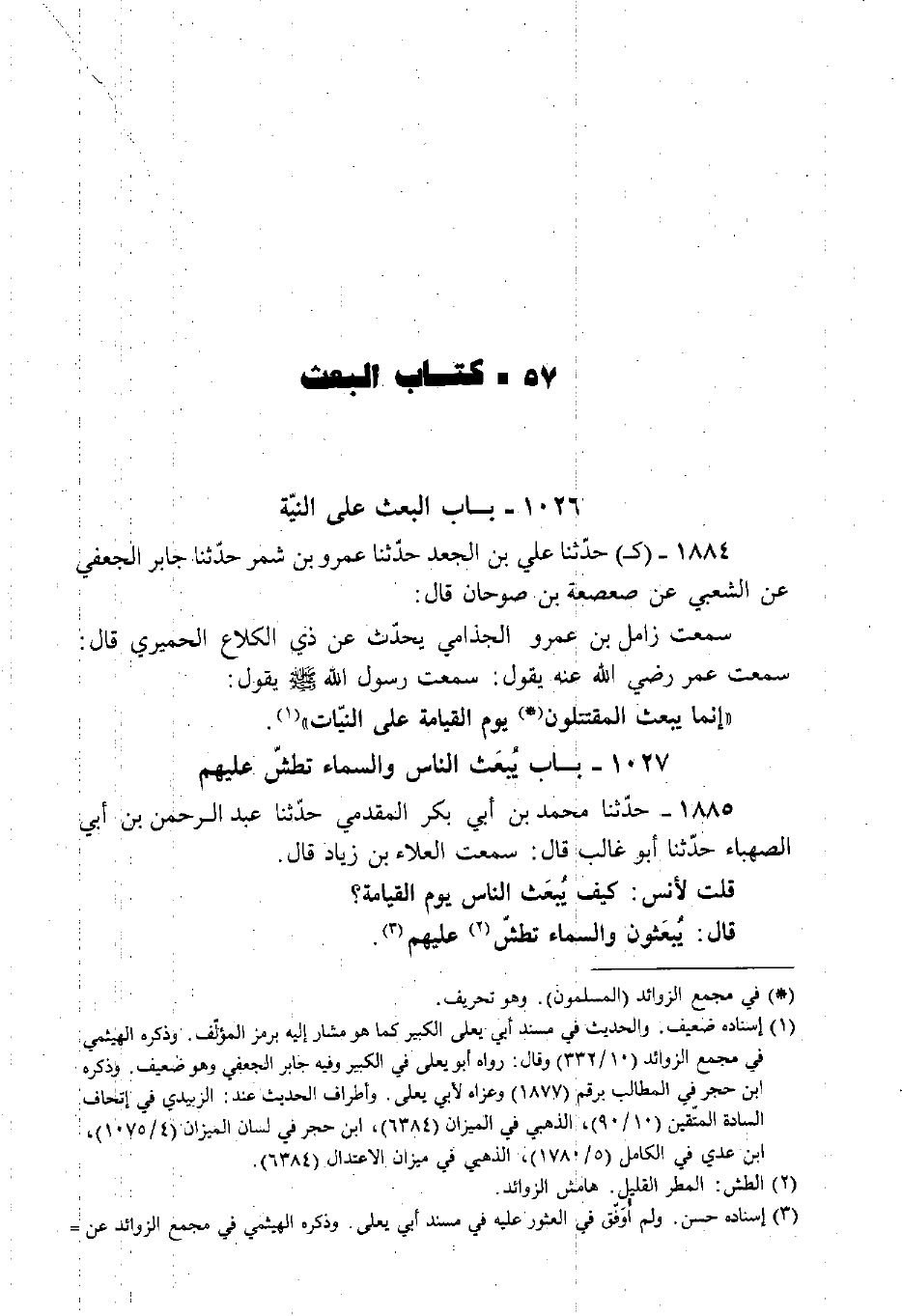 1884 - (كـ) حَدَّثَنَا عَلِيُّ بْنُ الْجَعْدِ، حَدَّثَنَا عَمْرُو بْنُ شَمِرٍ، حَدَّثَنَا جَابِرٌ الْجُعْفِيُّ، عَنِ الشَّعْبِيِّ، عَنْ صَعْصَعَةَ بْنِ صُوحَانَ قَالَ: سَمِعْتُ زَامِلَ بْنَ عَمْرٍو الْجُذَامِيَّ يُحَدِّثُ عَنْ ذِي الْكَلاعِ الْحِمْيَرِيِّ قَالَ: سَمِعْتُ عُمَرَ رَضِيَ اللَّهُ عَنْهُ يَقُولُ: سَمِعْتُ رَسُولَ اللَّهِ صَلَّى اللَّهُ عَلَيْهِ وَسَلَّمَ يَقُولُ: «إِنَّمَا يُبْعَثُ الْمُقْتَتِلُونَ يَوْمَ الْقِيَامَةِ عَلَى النِّيَّاتِ» .