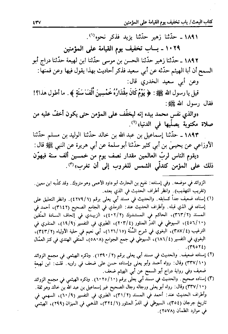1893 - حَدَّثَنَا إِسْمَاعِيلُ بْنُ عَبْدِ اللَّهِ بْنِ خَالِدٍ، حَدَّثَنَا الْوَلِيدُ بْنُ مُسْلِمٍ، حَدَّثَنَا الأَوْزَاعِيُّ، عَنْ يَحْيَى بْنِ أَبِي كَثِيرٍ، حَدَّثَنَا أَبُو سَلَمَةَ، عَنْ أَبِي هُرَيْرَةَ، عَنِ النَّبِيِّ صَلَّى اللَّهُ عَلَيْهِ وَسَلَّمَ قَالَ: «يَقُومُ النَّاسُ لِرَبِّ الْعَالَمِينَ مِقْدَارَ نِصْفِ يَوْمٍ مِنْ خَمْسِينَ أَلْفَ سَنَةٍ فَيُهَوَّنُ ذَلِكَ عَلَى الْمُؤْمِنِ كَتَدَلِّي الشَّمْسِ لِلْغُرُوبِ إِلَى أَنْ تَغْرُبَ» .