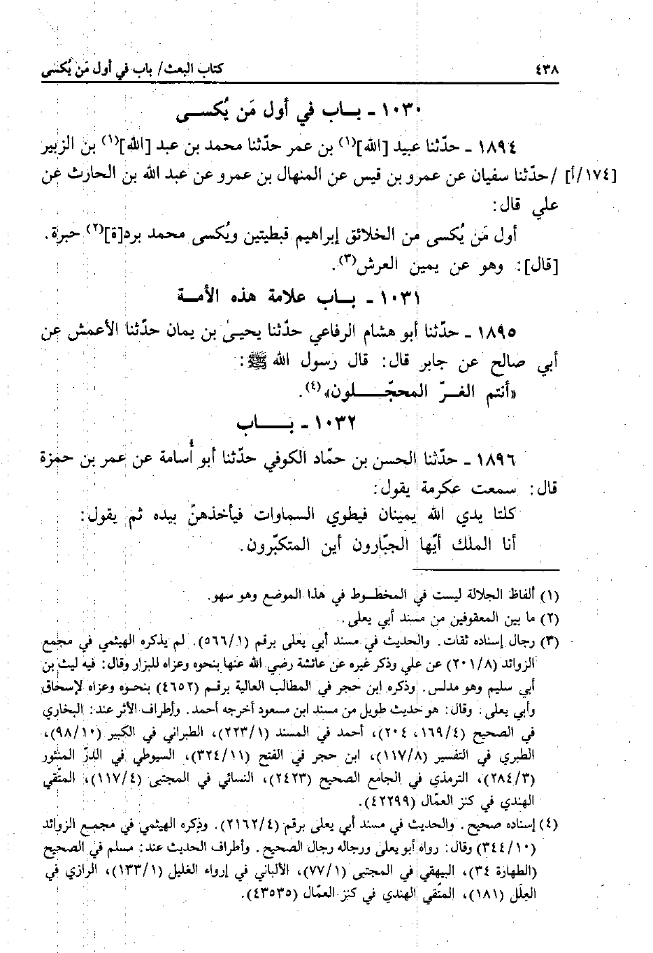 1894 - حَدَّثَنَا عُبَيْدُ اللَّهِ بْنُ عُمَرَ، حَدَّثَنَا مُحَمَّدُ بْنُ عَبْدِ اللَّهِ بْنِ الزُّبَيْرِ، حَدَّثَنَا سُفْيَانُ، عَنْ عَمْرِو بْنِ قَيْسٍ، عَنِ الْمِنْهَالِ بْنِ عَمْرٍو، عَنْ عَبْدِ اللَّهِ بْنِ الْحَارِثِ، عَنْ عَلِيٍّ قَالَ: أَوَّلُ مَنْ يُكْسَى مِنَ الْخَلائِقِ إِبْرَاهِيمُ قِبْطِيَّتَيْنِ وَيُكْسَى مُحَمَّدٌ بُرْدَةً حِبَرَةً.