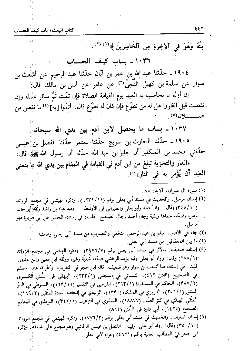 1904 - حَدَّثَنَا عَبْدُ اللَّهِ بْنُ عُمَرَ بْنِ أَبَانَ، حَدَّثَنَا عَبْدُ الرَّحِيمِ، عَنْ أَشْعَثَ بْنِ سَوَّارٍ، عَنْ سَلَمَةَ بْنِ كُهَيْلٍ التِّنْعِيِّ، عَنْ عَامِرٍ، عَنْ أَنَسِ بْنِ مَالِكٍ قَالَ: إِنَّ أَوَّلَ مَا يُحَاسَبُ بِهِ الْعَبْدُ يَوْمَ الْقِيَامَةِ الصَّلاةُ، فَإِنْ تَمَّتْ تَمَّ سَائِرُ عَمَلِهِ، وَإِنْ نَقَصَتْ قِيلَ: انْظُرُوا هَلْ لَهُ مِنْ تَطَوُّعٍ فَإِنْ كَانَ لَهُ تَطَوُّعٌ قَالَ: أَتِمُّوا بِهِ مَا نَقَصَ مِنْ صَلاتِهِ.