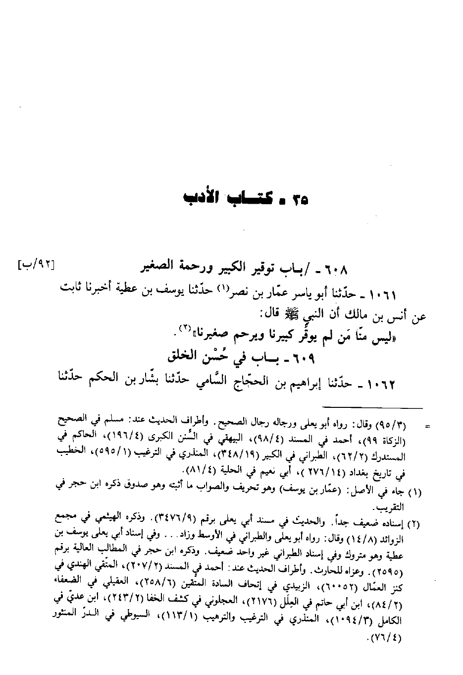1061 - حَدَّثَنَا أَبُو يَاسِرٍ عَمَّارُ بْنُ نَصْرٍ، حَدَّثَنَا يُوسُفُ بْنُ عَطِيَّةَ: أَخْبَرَنَا ثَابِتٌ، عَنْ أَنَسِ بْنِ مَالِكٍ أَنَّ النَّبِيَّ صَلَّى اللَّهُ عَلَيْهِ وَسَلَّمَ قَالَ: «لَيْسَ مِنَّا مَنْ لَمْ يُوَقِّرْ كَبِيرَنَا وَيَرْحَمْ صَغِيرَنَا» .