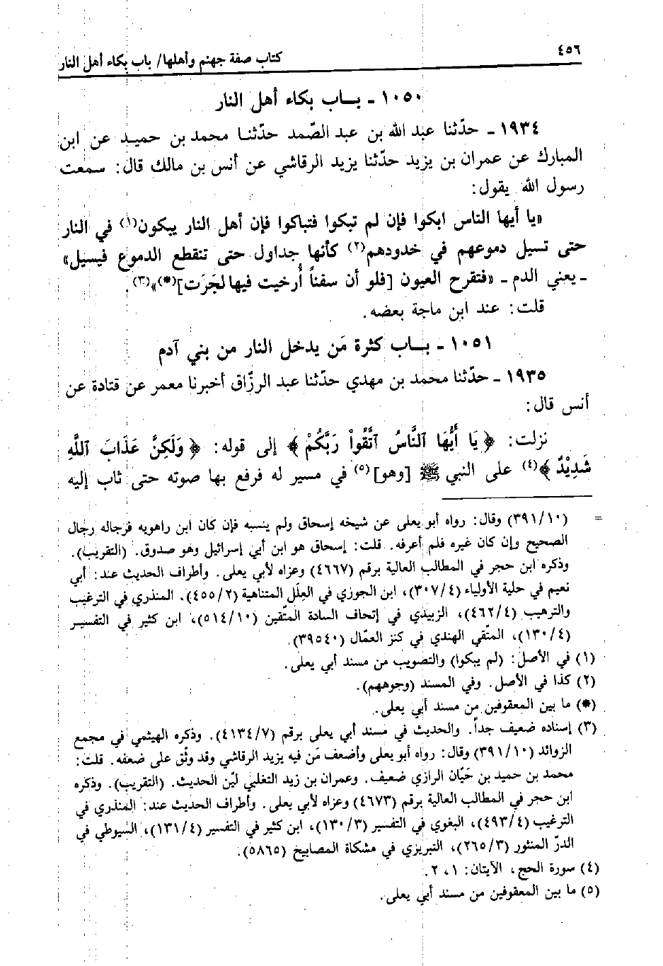1934 - حَدَّثَنَا عَبْدُ اللَّهِ بْنُ عَبْدِ الصَّمَدِ، حَدَّثَنَا مُحَمَّدُ بْنُ حُمَيْدٍ، عَنِ ابْنِ الْمُبَارَكِ، عَنْ عِمْرَانَ بْنِ يَزِيدَ، حَدَّثَنَا يَزِيدُ الرَّقَاشِيُّ، عَنْ أَنَسِ بْنِ مَالِكٍ قَالَ: سَمِعْتُ رَسُولَ اللَّهِ يَقُولُ: «يَا أَيُّهَا النَّاسُ ابْكُوا فَإِنْ لَمْ تَبْكُوا فَتَبَاكَوْا؛ فَإِنَّ أَهْلَ النَّارِ يَبْكُونَ فِي النَّارِ حَتَّى تَسِيلَ دُمُوعُهُمْ فِي خُدُودِهِمْ كَأَنَّهَا جَدَاوِلُ حَتَّى تَنْقَطِعَ الدُّمُوعُ فَيَسِيلُ» - يَعْنِي الدَّمُ - «فَتَقْرَحُ الْعُيُونُ فَلَوْ أَنَّ سُفُنًا أُرْخِيَتْ فِيهَا لَجَرَتْ» .