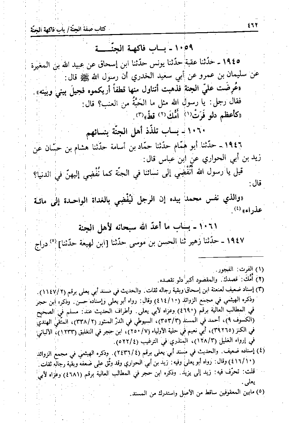 1946 - حَدَّثَنَا أَبُو هَمَّامٍ، حَدَّثَنَا حَمَّادُ بْنُ أُسَامَةَ، حَدَّثَنَا هِشَامُ بْنُ حَسَّانٍ، عَنْ زَيْدِ بْنِ أَبِي الْحَوَارِيِّ، عَنِ ابْنِ عَبَّاسٍ قَالَ: قِيلَ يَا رَسُولَ اللَّهِ: أَنُفْضِي إِلَى نِسَائِنَا فِي الْجَنَّةِ كَمَا نُفْضِي إِلَيْهِنَّ فِي الدُّنْيَا؟ قَالَ: «وَالَّذِي نَفْسُ مُحَمَّدٍ بِيَدِهِ إِنَّ الرَّجُلَ لَيُفْضِي بِالْغَدَاةِ الْوَاحِدَةِ إِلَى مِائَةِ عَذْرَاءَ» .
