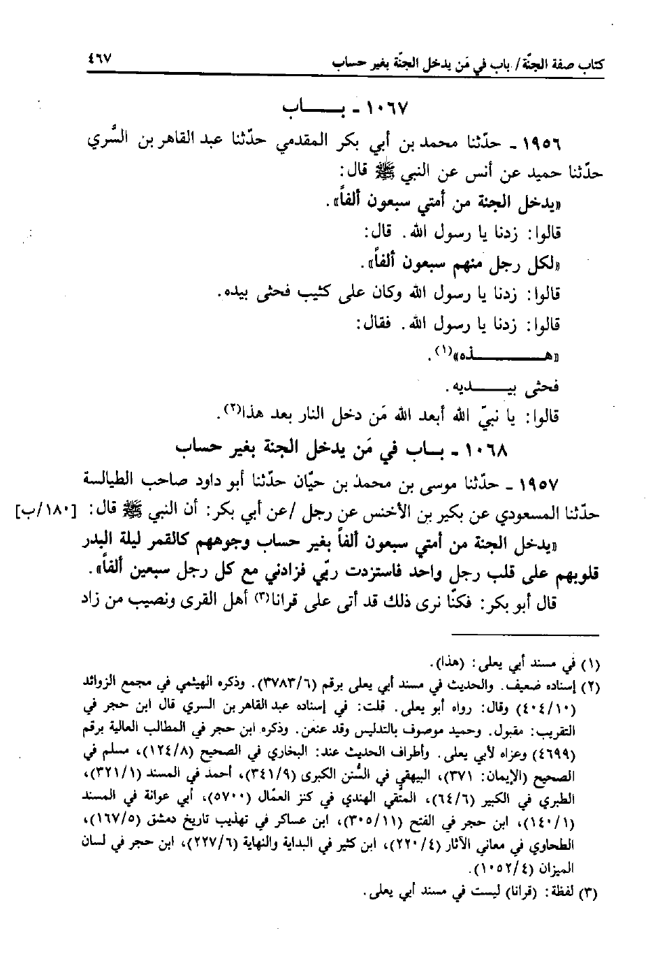 1957 - حَدَّثَنَا مُوسَى بْنُ مُحَمَّدِ بْنِ حَيَّانَ، حَدَّثَنَا أَبُو دَاوُدَ صَاحِبُ الطَّيَالِسَةِ، حَدَّثَنَا الْمَسْعُودُ، عَنْ بُكْيَرِ بْنِ الأَخْنَسِ، عَنْ رَجُلٍ، عَنْ أَبِي بَكْرٍ: أَنَّ النَّبِيَّ صَلَّى اللَّهُ عَلَيْهِ وَسَلَّمَ قَالَ: «يَدْخُلُ الْجَنَّةَ مِنْ أُمَّتِي سَبْعُونَ أَلْفًا بِغَيْرِ حِسَابٍ وُجُوهُهُمْ كَالْقَمَرِ لَيْلَةَ الْبَدْرِ، قُلُوبُهُمْ عَلَى قَلْبِ رَجُلٍ وَاحِدٍ فَاسْتَزَدْتُ رَبِّي فَزَادَنِي مَعَ كُلِّ رَجُلٍ سَبْعِينَ أَلْفًا» .