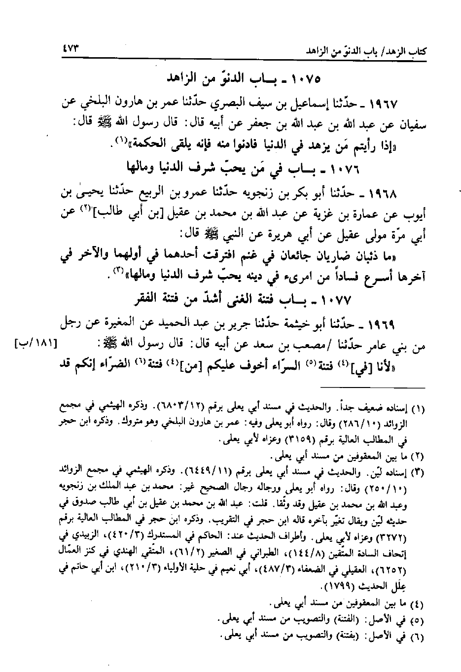 1968 - حَدَّثَنَا أَبُو بَكْرِ بْنِ زَنْجَوَيْهِ، حَدَّثَنَا عَمْرُو بْنُ الرَّبِيعِ، حَدَّثَنَا يَحْيَى بْنُ أَيُّوبَ، عَنْ عُمَارَةَ بْنُ غَزِيَّةَ، عَنْ عَبْدِ اللَّهِ بْنِ مُحَمَّدِ بْنِ عَقِيلِ بْنِ أَبِي طَالِبٍ، عَنْ أَبِي مُرَّةَ مَوْلَى عَقِيلٍ، عَنْ أَبِي هُرَيْرَةَ، عَنِ النَّبِيِّ صَلَّى اللَّهُ عَلَيْهِ وَسَلَّمَ قَالَ: «مَا ذِئْبَانِ ضارِيَّانِ جَائِعَانِ فِي غَنَمٍ افْتَرَقَتْ أَحَدُهُمَا فِي أَوَّلِهِمَا وَالآخَرُ فِي آخِرِهَا أَسْرَعُ فَسَادًا مِنِ امْرِئٍ فِي دِينِهِ يُحِبُّ شَرَفَ الدُّنْيَا وَمَالَهَا» .