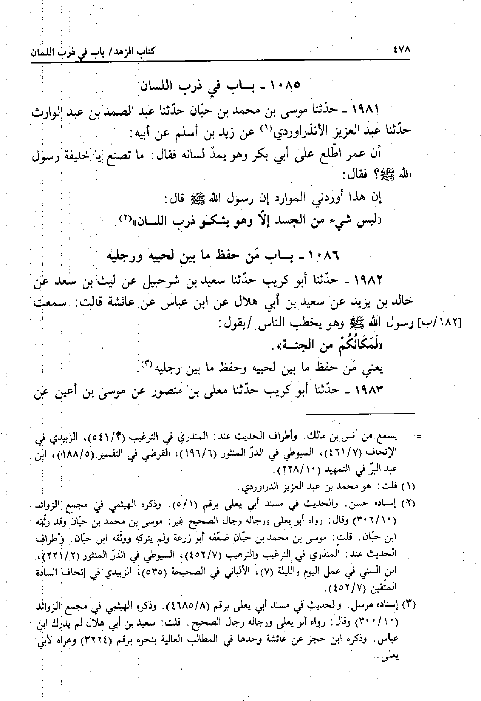 1981 - حَدَّثَنَا مُوسَى بْنُ مُحَمَّدِ بْنِ حَيَّانَ، حَدَّثَنَا عَبْدُ الصَّمَدِ بْنُ عَبْدِ الْوَارِثِ، حَدَّثَنَا عَبْدُ الْعَزِيزِ الأَنْدَرَاوُرْدِيُّ، عَنْ زَيْدِ بْنِ أَسْلَمَ، عَنْ أَبِيهِ: أَنَّ عُمَرَ اطَّلَعَ عَلَى أَبِي بَكْرٍ وَهُوَ يَمُدُّ لِسَانَهُ فَقَالَ: مَا تَصْنَعُ يَا خَلِيفَةَ رَسُولِ اللَّهِ صَلَّى اللَّهُ عَلَيْهِ وَسَلَّمَ فَقَالَ: إِنَّ هَذَا أَوْرَدَنِي الْمَوَارِدَ إِنَّ رَسُولَ اللَّهِ صَلَّى اللَّهُ عَلَيْهِ وَسَلَّمَ قَالَ: «لَيْسَ شَيْءٌ مِنَ الْجَسَدِ إِلا وَهُوَ يَشْكُو ذَرَبَ اللِّسَانِ» .