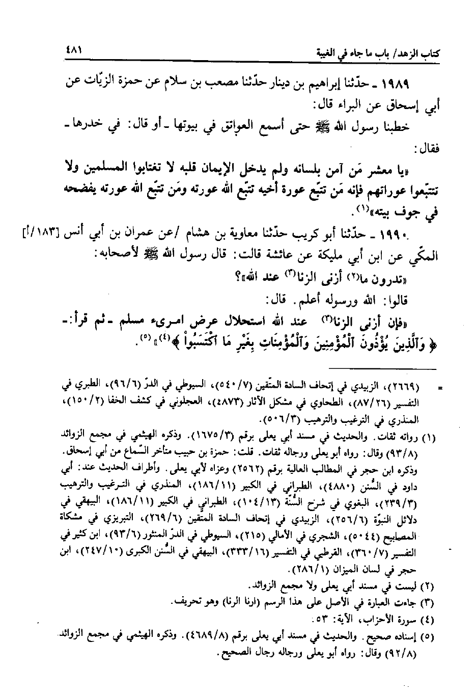 1989 - حَدَّثَنَا إِبْرَاهِيمُ بْنُ دِينَارٍ، حَدَّثَنَا مُصْعَبُ بْنُ سَلامٍ، عَنْ حَمْزَةَ الزَّيَّاتِ، عَنْ أَبِي إِسْحَاقَ، عَنِ الْبَرَاءِ قَالَ: خَطَبَنَا رَسُولُ اللَّهِ صَلَّى اللَّهُ عَلَيْهِ وَسَلَّمَ حَتَّى أَسْمَعَ الْعَوَاتِقَ فِي بُيُوتِهَا - أَوْ قَالَ: فِي خِدْرِهَا - فَقَالَ: «يَا مَعْشَرَ مَنْ آمَنَ بِلِسَانِهِ وَلَمْ يَدْخُلِ الإِيمَانُ قَبْلَهُ لا تَغْتَابُوا الْمُسْلِمِينَ، وَلا تَتَّبِعُوا عَوْرَاتِهِمْ فَإِنَّهُ مَنْ تَتَبَّعَ عَوْرَةَ أَخِيهِ تَتَبَّعَ اللَّهُ عَوْرَتَهُ، وَمَنْ تَتَبَّعَ اللَّهُ عَوْرَتَهُ يَفْضَحُهُ فِي جَوْفِ بَيْتِهِ» .