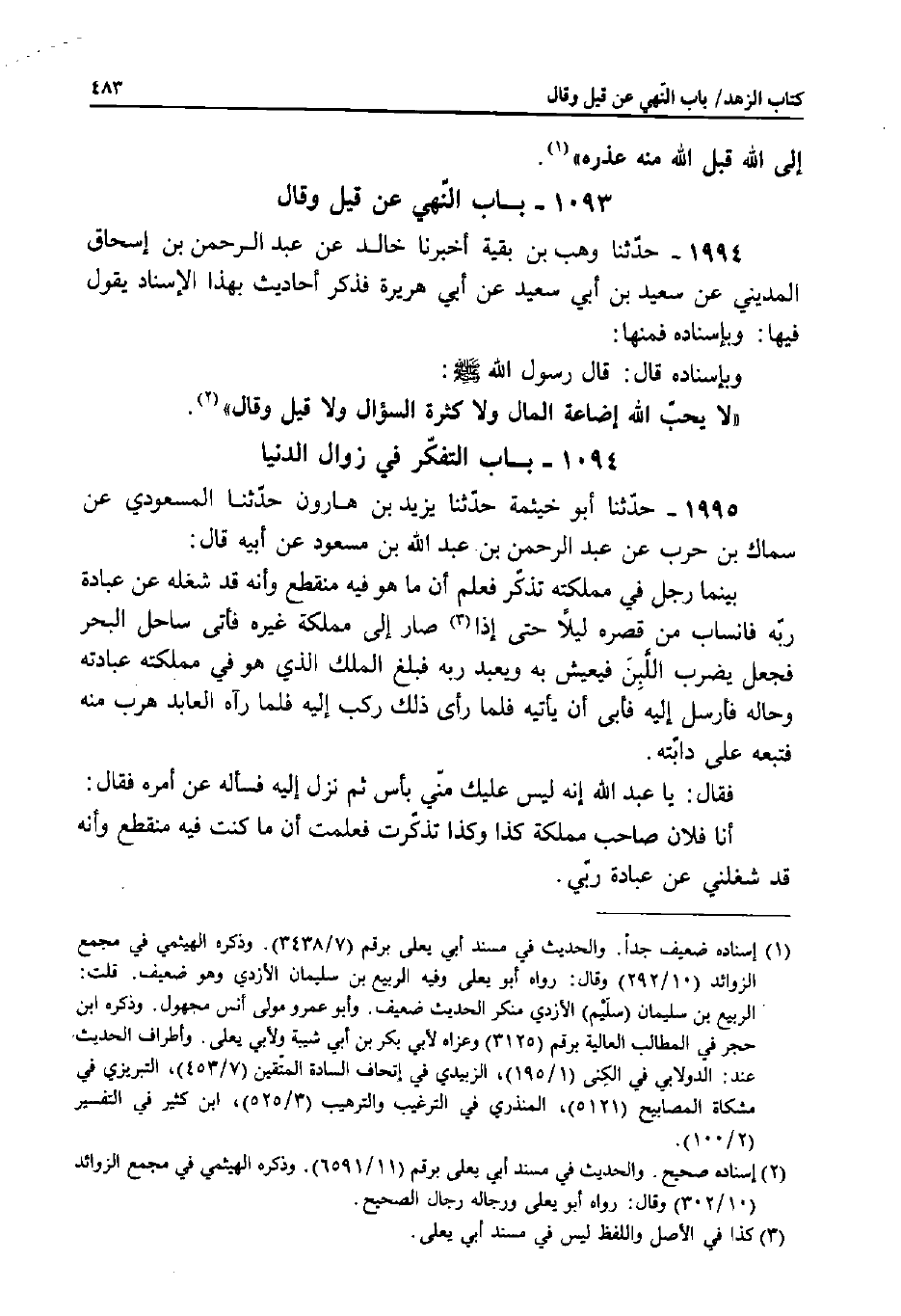 1995 - حَدَّثَنَا أَبُو خَيْثَمَةَ، حَدَّثَنَا يَزِيدُ بْنُ هَارُونَ، حَدَّثَنَا الْمَسْعُودِيُّ، عَنْ سِمَاكِ بْنِ حَرْبٍ، عَنْ عَبْدِ الرَّحْمَنِ بْنِ عَبْدِ اللَّهِ بْنِ مَسْعُودٍ، عَنْ أَبِيهِ قَالَ: بَيْنَمَا رَجُلٌ فِي مَمْلَكَتِهِ تَذَكَّرَ فَعَلِمَ أَنَّ مَا هُوَ فِيهِ مُنْقَطِعٌ وَأَنَّهُ قَدْ شَغَلَهُ عَنْ عِبَادَةِ رَبِّهِ، فَانْسَابَ مِنْ قَصْرِهِ لَيْلا حَتَّى إِذَا صَارَ إِلَى مَمْلَكَةِ غَيْرِهِ فَأَتَى عَلَى سَاحِلِ الْبَحْرِ فَجَعَلَ يَضْرِبُ اللَّبِنَ فَيَعِيشُ وَيَعْبُدُ رَبَّهُ فَبَلَغَ الْمَلِكَ الَّذِي هُوَ فِي مَمْلَكَتِهِ عِبَادَتُهُ وَحَالُهُ فَأَرْسَلَ إِلَيْهِ فَأَبَى أَنْ يَأْتِيَهُ؛ فَلَمَّا رَأَى ذَلِكَ رَكِبَ إِلَيْهِ فَلَمَّا رَآهُ الْعَابِدُ هَرَبَ مِنْهُ فَتَبِعَهُ عَلَى دَابَّتِهِ.