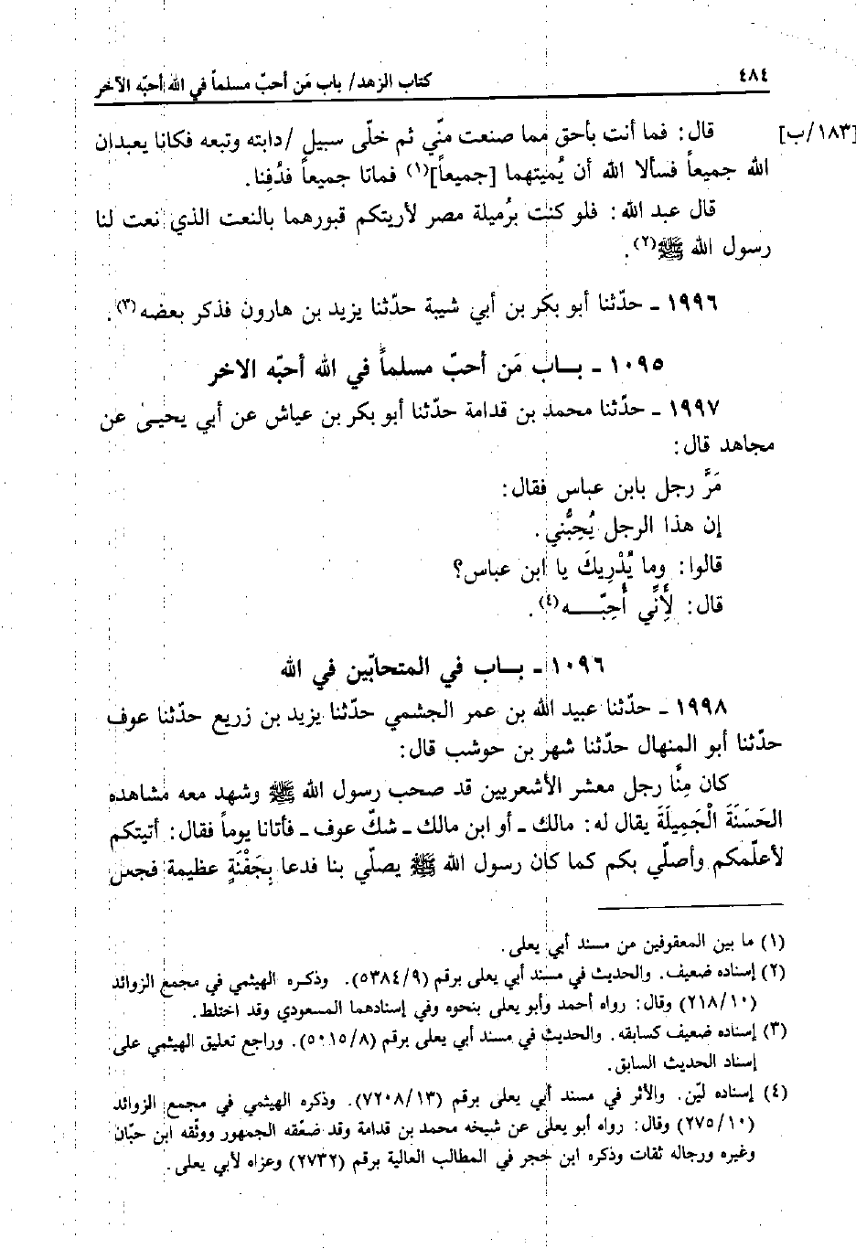 1997 - حَدَّثَنَا مُحَمَّدُ بْنُ قُدَامَةَ، حَدَّثَنَا أَبُو بَكْرِ بْنُ عَيَّاشٍ، عَنْ أَبِي يَحْيَى، عَنْ مُجَاهِدٍ قَالَ: مَرَّ رَجُلٌ بِابْنِ عَبَّاسٍ فَقَالَ: إِنَّ هَذَا الرَّجُلَ يُحِبُّنِي.