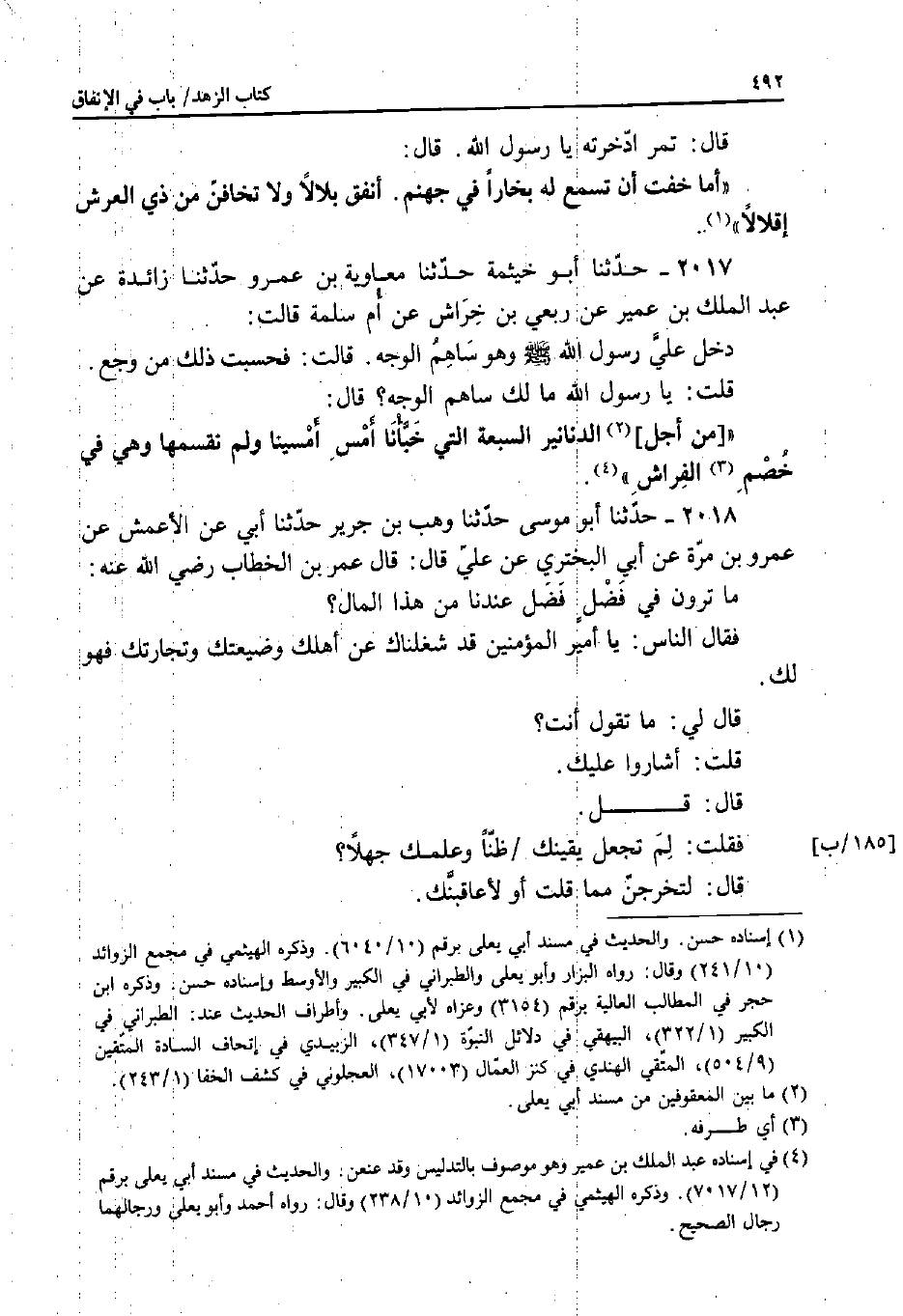 2018 - حَدَّثَنَا أَبُو مُوسَى، حَدَّثَنَا وَهْبُ بْنُ جَرِيرٍ، حَدَّثَنَا أَبِي، عَنِ الأَعْمَشِ، عَنْ عَمْرِو بْنِ مُرَّةَ، عَنْ أَبِي الْبَخْتَرِيِّ، عَنْ عَلِيٍّ قَالَ: قَالَ عُمَرُ بْنُ الْخَطَّابِ رَضِيَ اللَّهُ عَنْهُ: مَا تَرَوْنَ فِي فَضْلٍ فَضَلَ عِنْدَنَا مِنْ هَذَا الْمَالِ ".