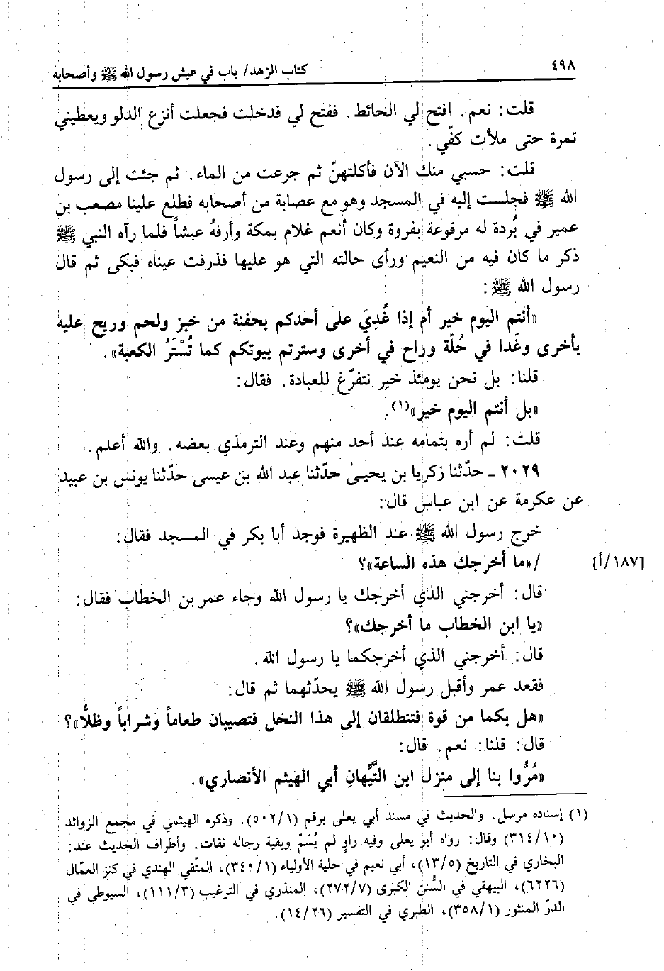 ثُمَّ جِئْتُ إِلَى رَسُولِ اللَّهِ صَلَّى اللَّهُ عَلَيْهِ وَسَلَّمَ فَجَلَسْتُ إِلَيْهِ فِي الْمَسْجِدِ وَهُوَ مَعَ عِصَابَةٍ مِنْ أَصْحَابِهِ، فَطَلَع عَلَيْنَا مُصْعَبُ بْنُ عُمَيْرٍ فِي بُرْدَةِ لَهُ مَرْقُوعَةٍ بِفَرْوَةٍ وَكَانَ أَنْعَمَ غُلامٍ بِمَكَّةَ وَأَرْفَهُ عَيْشًا فَلَمَّا رَآهُ النَّبِيُّ صَلَّى اللَّهُ عَلَيْهِ وَسَلَّمَ ذَكَرَ مَا كَانَ فِيهِ مِنَ النَّعِيمِ وَرَأَى حَالَتَهُ الَّتِي هُوَ عَلَيْهَا فَذَرَفَتْ عَيْنَاهُ فَبَكَى ثُمَّ قَالَ رَسُولُ اللَّهِ صَلَّى اللَّهُ عَلَيْهِ وَسَلَّمَ: «أَنْتُمُ الْيَوْمَ خَيْرٌ أَمْ إِذَا غُدِيَ عَلَى أَحَدِكُمْ بِحِفْنَةٍ مِنْ خُبْزٍ وَلَحْمٍ وَرِيحَ عَلَيْهِ بِأُخْرَى وَغَدَا فِي حُلَّةٍ وَرَاحَ فِي أُخْرَى وَسَتَرْتُمْ بُيُوتَكُمْ كَمَا تُسْتَرُ الْكَعْبَةُ» .