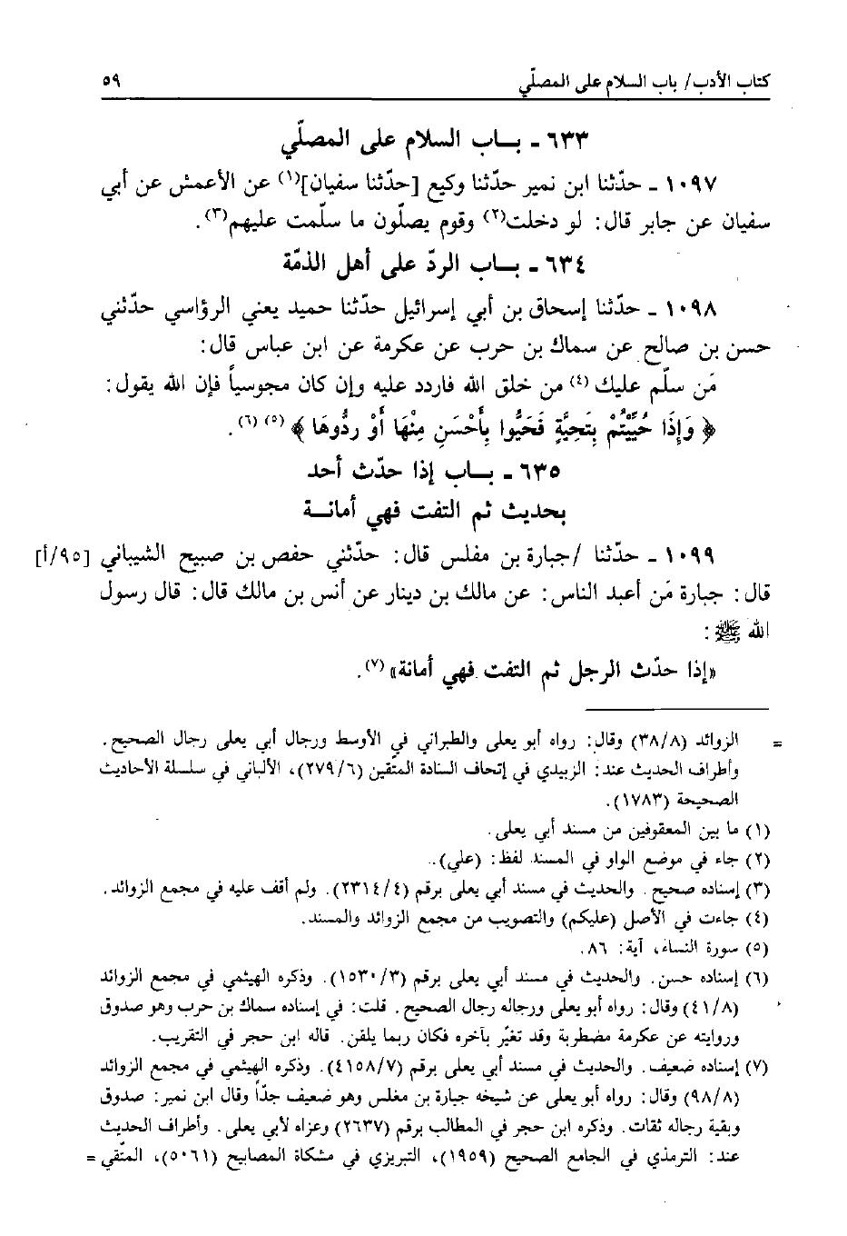1098 - حَدَّثَنَا إِسْحَاقُ بْنُ أَبِي إِسْرَائِيلَ، حَدَّثَنَا حُمَيْدٌ يَعْنِي الرُّؤَاسِيَّ، حَدَّثَنِي حَسَنُ بْنُ صَالِحٍ، عَنْ سِمَاكِ بْنِ حَرْبٍ، عَنْ عِكْرِمَةَ، عَنِ ابْنِ عَبَّاسٍ قَالَ: مَنْ سَلَّمَ عَلَيْكَ مِنْ خَلْقِ اللَّهِ فَارْدُدْ عَلَيْهِ وَإِنْ كَانَ مَجُوسِيًّا، فَإِنَّ اللَّهَ يَقُولُ: {وَإِذَا حُيِّيتُمْ بِتَحِيَّةٍ فَحَيُّوا بِأَحْسَنَ مِنْهَا أَوْ رُدُّوهَا} [النساء: 86] .