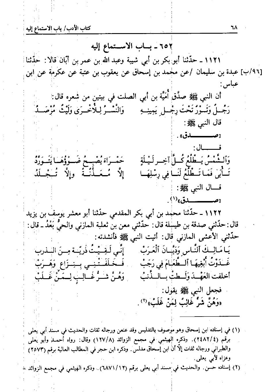 1121 - حَدَّثَنَا أَبُو بَكْرِ بْنُ أَبِي شَيْبَةَ وَعَبْدُ اللَّهِ بْنُ عُمَرَ بْنِ أَبَانَ قَالا: حَدَّثَنَا عَبْدَةُ بْنُ سُلَيْمَانَ، عَنْ مُحَمَّدِ بْنِ إِسْحَاقَ، عَنْ يَعْقُوبَ بْنِ عُتْبَةَ، عَنْ عِكْرِمَةَ، عَنِ ابْنِ عَبَّاسٍ: أَنَّ النَّبِيَّ صَلَّى اللَّهُ عَلَيْهِ وَسَلَّمَ صَدَّقَ أَنِيَةَ بْنَ أَبِي الصَّلْتِ فِي بَيْتَيْنِ مِنْ شِعْرِهِ قَالَ:
