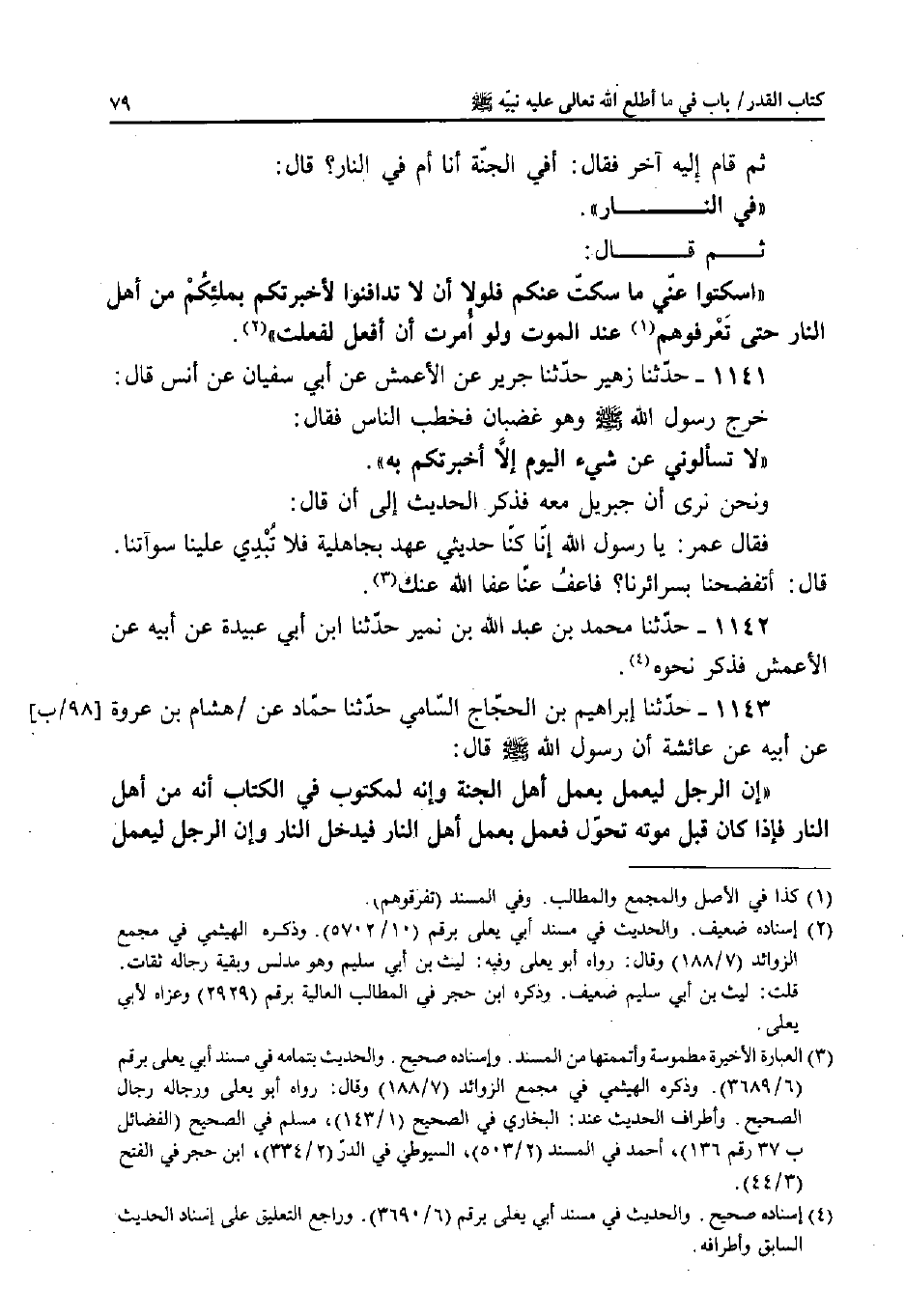 1143 - حَدَّثَنَا إِبْرَاهِيمُ بْنُ الْحَجَّاجِ السَّامِيُّ، حَدَّثَنَا حَمَّادٌ، عَنْ هِشَامِ بْنِ عُرْوَةَ، عَنْ أَبِيهِ، عَنْ عَائِشَةَ أَنَّ رَسُولَ اللَّهِ صَلَّى اللَّهُ عَلَيْهِ وَسَلَّمَ قَالَ: «إِنَّ الرَّجُلَ لَيَعْمَلُ بِعَمَلِ أَهْلِ الْجَنَّةِ وَإِنَّهُ لَمَكْتُوبٌ فِي الْكِتَابِ أَنَّهُ مِنْ أَهْلِ النَّارِ، فَإِذَا كَانَ قَبْلَ مَوْتِهِ تَحَوَّلَ فَعَمِلَ بِعَمَلِ أَهْلِ النَّارِ فَيَدْخُلُ النَّارَ.