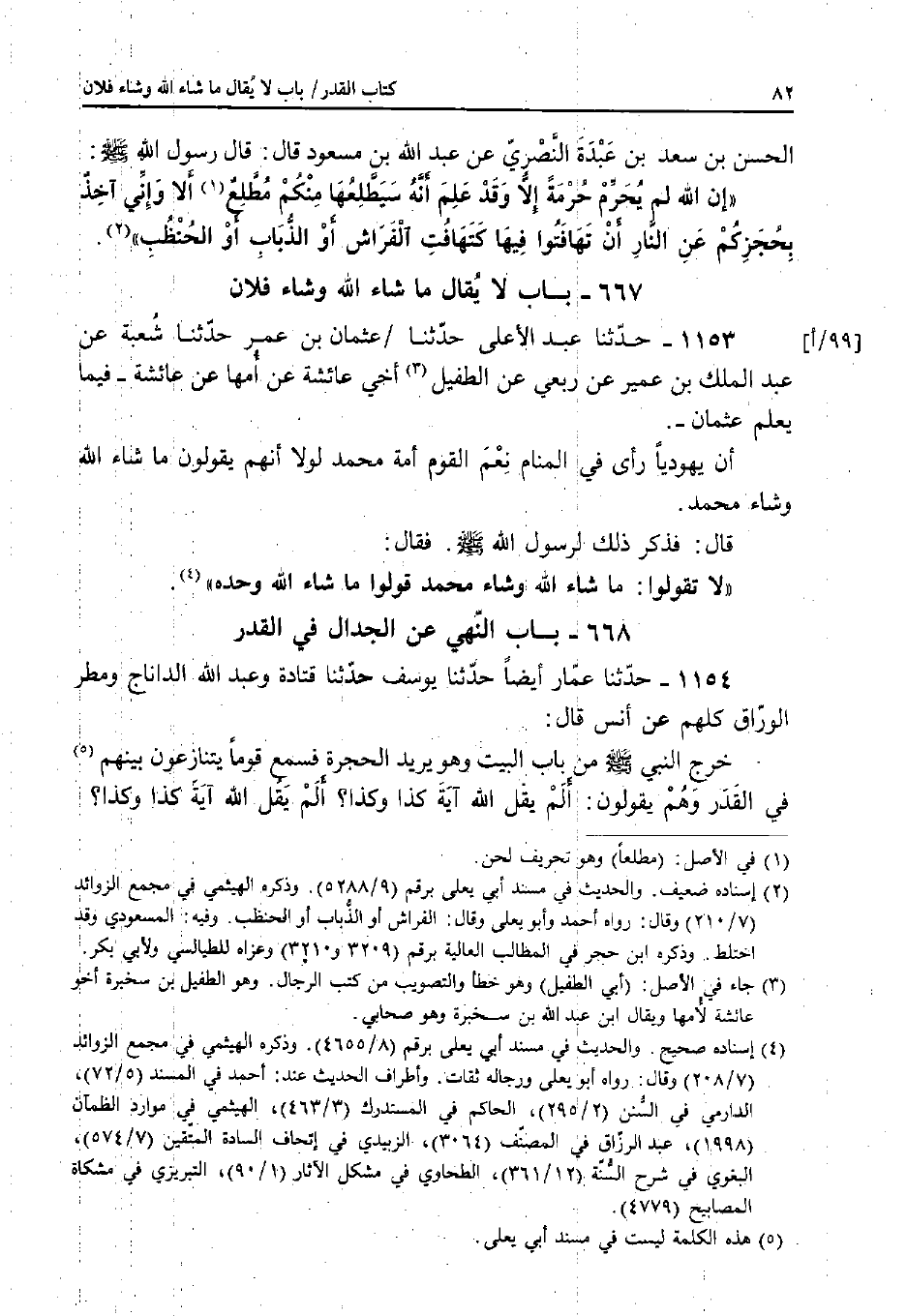 1154 - حَدَّثَنَا عَمَّارٌ أَيْضًا، حَدَّثَنَا يُوسُفُ، حَدَّثَنَا قَتَادَةُ وَعَبْدُ اللَّهِ الدَّانَاجُ وَمَطَرٌ الْوَرَّاقُ كُلُّهُمْ عَنْ أَنَسٍ قَالَ: خَرَجَ النَّبِيُّ صَلَّى اللَّهُ عَلَيْهِ وَسَلَّمَ مِنْ بَابِ الْبَيْتِ وَهُوَ يُرِيدُ الْحُجْرَةَ، فَسَمِعَ قَوْمًا يَتَنَازَعُونَ بَيْنَهُمْ فِي الْقَدَرِ وَهُمْ يَقُولُونَ: أَلَمْ يَقُلِ اللَّهُ آيَةَ كَذَا وَكَذَا؟ أَلَمْ يَقُلِ اللَّهُ آيَةَ كَذَا وَكَذَا؟