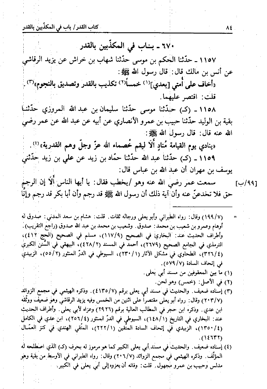1158 - (كـ) حَدَّثَنَا مُوسَى، حَدَّثَنَا سُلَيْمَانُ بْنُ عَبْدِ اللَّهِ الْمَرْوَزِيُّ، حَدَّثَنَا بَقِيَّةُ بْنُ الْوَلِيدِ، حَدَّثَنَا حَبِيبُ بْنُ عَمْرٍو الأَنْصَارِيُّ، عَنْ أَبِيهِ، عَنْ عَبْدِ اللَّهِ، عَنْ عُمَرَ رَضِيَ اللَّهُ عَنْهُ قَالَ: قَالَ رَسُولُ اللَّهِ صَلَّى اللَّهُ عَلَيْهِ وَسَلَّمَ: " يُنَادِي يَوْمَ الْقِيَامَةِ مُنَادٍ: أَلا لِيَقُمْ خُصَمَاءُ اللَّهِ عَزَّ وَجَلَّ وُهَمُ الْقَدَرِيَّةُ ".