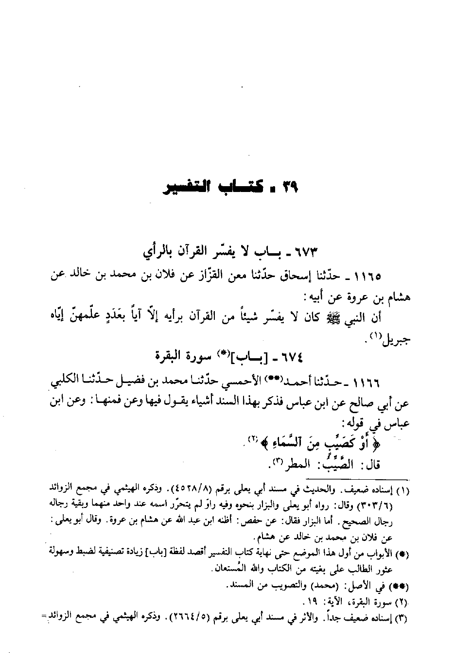 1165 - حَدَّثَنَا إِسْحَاقُ، حَدَّثَنَا مَعْنٌ الْقَزَّازُ، عَنْ فُلانِ بْنِ مُحَمَّدِ بْنِ خَالِدٍ، عَنْ هِشَامِ بْنِ عُرْوَةَ، عَنْ أَبِيهِ: أَنَّ النَّبِيَّ صَلَّى اللَّهُ عَلَيْهِ وَسَلَّمَ كَانَ لا يُفَسِّرُ شَيْئًا مِنَ الْقُرْآنِ بِرَأْيِهِ إِلا آيًا تُعَدُّ عَلَّمَهُنَّ إِيَّاهُ جِبْرِيلُ؟