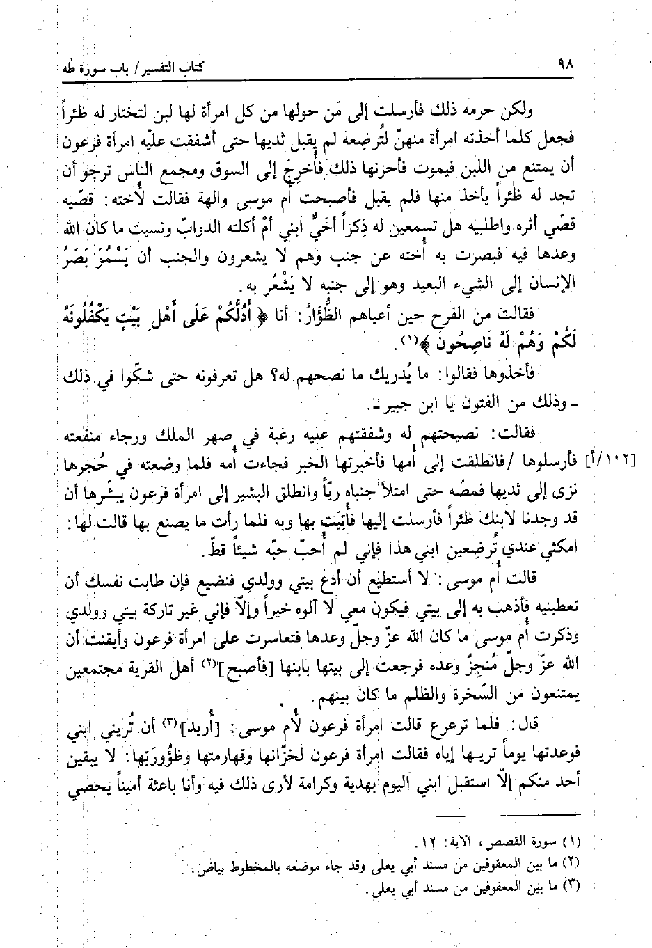 فَأَخَذُوهَا فَقَالُوا: مَا يُدْرِيكِ مَا نُصْحُهُمْ لَهُ؟ هَلْ تَعْرِفِينَهُ حَتَّى شَكُّوا فِي ذَلِكَ وَذَلِكَ مِنَ الْفُتُونِ يَا ابْنَ جُبَيْرٍ فَقَالَتْ: نَصِيحَتُهُمْ لَهُ وَشَفَقَتُهُمْ عَلَيْهِ رَغْبَةٌ فِي صِهْرِ الْمَلِكِ وَرَجَاءُ مَنْفَعَتِهِ فَأَرْسَلُوهَا، فَانْطَلَقَتْ إِلَى أُمِّهَا فَأَخْبَرَتْهَا الْخَبَرَ فَجَاءَتْ أُمُّهُ فَلَمَّا وَضَعَتْهُ فِي حِجْرِهَا نَزَى إِلَى ثَدْيِهَا فَمَصَّهُ حَتَّى امْتَلأَ جَنْبَاهُ رَيًّا وَانْطَلَقَ الْبَشِيرُ إِلَى امْرَأَةِ فِرْعَوْنَ يُبَشِّرُهَا أَنْ قَدْ وَجَدْنَا لابْنِكِ ظِئْرًا فَأَرْسَلَتْ إِلَيْهَا فَأُتِيَتْ بِهَا وَبِهِ، فَلَمَّا رَأَتْ مَا يَصْنَعُ بِهَا قَالَتْ لَهَا: امْكُثِي عِنْدِي تُرْضِعِينَ ابْنِي هَا فَإِنِّي لَمْ أُحِبَّ حُبَّهُ شَيْئًا قَطُّ.
