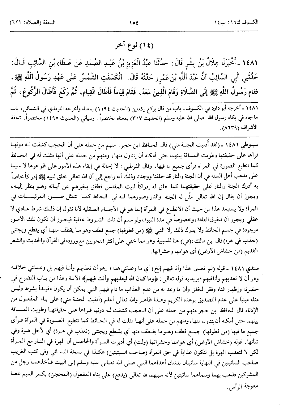 نَوْعٌ آخَرُ 1481 - أَخْبَرَنَا هِلَالُ بْنُ بِشْرٍ قَالَ حَدَّثَنَا عَبْدُ الْعَزِيزِ بْنُ عَبْدِ الصَّمَدِ عَنْ عَطَاءِ بْنِ السَّائِبِ قَالَ حَدَّثَنِي أَبِي السَّائِبُ أَنَّ عَبْدَ اللَّهِ بْنَ عَمْرٍو حَدَّثَهُ قَالَ انْكَسَفَتْ الشَّمْسُ عَلَى عَهْدِ رَسُولِ اللَّهِ صَلَّى اللَّهُ عَلَيْهِ وَسَلَّمَ فَقَامَ رَسُولُ اللَّهِ صَلَّى اللَّهُ عَلَيْهِ وَسَلَّمَ إِلَى الصَّلَاةِ وَقَامَ الَّذِينَ مَعَهُ فَقَامَ قِيَامًا فَأَطَالَ الْقِيَامَ ثُمَّ رَكَعَ فَأَطَالَ الرُّكُوعَ ثُمَّ رَفَعَ رَأْسَهُ وَسَجَدَ فَأَطَالَ السُّجُودَ ثُمَّ رَفَعَ رَأْسَهُ وَجَلَسَ فَأَطَالَ الْجُلُوسَ ثُمَّ سَجَدَ فَأَطَالَ السُّجُودَ ثُمَّ رَفَعَ رَأْسَهُ وَقَامَ فَصَنَعَ فِي الرَّكْعَةِ الثَّانِيَةِ مِثْلَ مَا صَنَعَ فِي الرَّكْعَةِ الْأُولَى مِنْ الْقِيَامِ وَالرُّكُوعِ وَالسُّجُودِ وَالْجُلُوسِ فَجَعَلَ يَنْفُخُ فِي آخِرِ سُجُودِهِ مِنْ الرَّكْعَةِ الثَّانِيَةِ وَيَبْكِي وَيَقُولُ لَمْ تَعِدْنِي هَذَا وَأَنَا فِيهِمْ لَمْ تَعِدْنِي هَذَا وَنَحْنُ نَسْتَغْفِرُكَ ثُمَّ رَفَعَ رَأْسَهُ وَانْجَلَتْ الشَّمْسُ فَقَامَ رَسُولُ اللَّهِ صَلَّى اللَّهُ عَلَيْهِ وَسَلَّمَ فَخَطَبَ النَّاسَ فَحَمِدَ اللَّهَ وَأَثْنَى عَلَيْهِ ثُمَّ قَالَ إِنَّ الشَّمْسَ وَالْقَمَرَ آيَتَانِ مِنْ آيَاتِ اللَّهِ عَزَّ وَجَلَّ فَإِذَا رَأَيْتُمْ كُسُوفَ أَحَدِهِمَا فَاسْعَوْا إِلَى ذِكْرِ اللَّهِ عَزَّ وَجَلَّ وَالَّذِي نَفْسُ مُحَمَّدٍ بِيَدِهِ لَقَدْ أُدْنِيَتْ الْجَنَّةُ مِنِّي حَتَّى لَوْ بَسَطْتُ يَدِي لَتَعَاطَيْتُ مِنْ قُطُوفِهَا وَلَقَدْ أُدْنِيَتْ النَّارُ مِنِّي حَتَّى لَقَدْ جَعَلْتُ أَتَّقِيهَا خَشْيَةَ أَنْ تَغْشَاكُمْ حَتَّى رَأَيْتُ فِيهَا امْرَأَةً مِنْ حِمْيَرَ تُعَذَّبُ فِي هِرَّةٍ رَبَطَتْهَا فَلَمْ تَدَعْهَا تَأْكُلُ مِنْ خَشَاشِ الْأَرْضِ فَلَا هِيَ أَطْعَمَتْهَا وَلَا هِيَ سَقَتْهَا حَتَّى مَاتَتْ فَلَقَدْ رَأَيْتُهَا تَنْهَشُهَا إِذَا أَقْبَلَتْ وَإِذَا وَلَّتْ تَنْهَشُ أَلْيَتَهَا وَحَتَّى رَأَيْتُ فِيهَا صَاحِبَ السِّبْتِيَّتَيْنِ أَخَا بَنِي الدَّعْدَاعِ يُدْفَعُ بِعَصًا ذَاتِ شُعْبَتَيْنِ فِي النَّارِ وَحَتَّى رَأَيْتُ فِيهَا صَاحِبَ الْمِحْجَنِ الَّذِي كَانَ يَسْرِقُ الْحَاجَّ بِمِحْجَنِهِ مُتَّكِئًا عَلَى مِحْجَنِهِ فِي النَّارِ يَقُولُ أَنَا سَارِقُ الْمِحْجَنِ