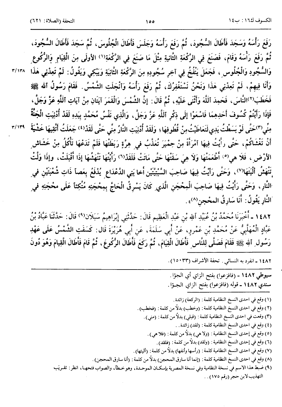 1482 - أَخْبَرَنَا مُحَمَّدُ بْنُ عُبَيْدِ اللَّهِ بْنِ عَبْدِ الْعَظِيمِ قَالَ حَدَّثَنِي إِبْرَاهِيمُ سَبَلَانُ قَالَ حَدَّثَنَا عَبَّادُ بْنُ عَبَّادٍ الْمُهَلَّبِيُّ عَنْ مُحَمَّدِ بْنِ عَمْرٍو عَنْ أَبِي سَلَمَةَ عَنْ أَبِي هُرَيْرَةَ قَالَ كَسَفَتْ الشَّمْسُ عَلَى عَهْدِ رَسُولِ اللَّهِ صَلَّى اللَّهُ عَلَيْهِ وَسَلَّمَ فَقَامَ فَصَلَّى لِلنَّاسِ فَأَطَالَ الْقِيَامَ ثُمَّ رَكَعَ فَأَطَالَ الرُّكُوعَ ثُمَّ قَامَ فَأَطَالَ الْقِيَامَ وَهُوَ دُونَ الْقِيَامِ الْأَوَّلِ ثُمَّ رَكَعَ فَأَطَالَ الرُّكُوعَ وَهُوَ دُونَ الرُّكُوعِ الْأَوَّلِ ثُمَّ سَجَدَ فَأَطَالَ السُّجُودَ ثُمَّ رَفَعَ ثُمَّ سَجَدَ فَأَطَالَ السُّجُودَ وَهُوَ دُونَ السُّجُودِ الْأَوَّلِ ثُمَّ قَامَ فَصَلَّى رَكْعَتَيْنِ وَفَعَلَ فِيهِمَا مِثْلَ ذَلِكَ ثُمَّ سَجَدَ سَجْدَتَيْنِ يَفْعَلُ فِيهِمَا مِثْلَ ذَلِكَ حَتَّى فَرَغَ مِنْ صَلَاتِهِ ثُمَّ قَالَ إِنَّ الشَّمْسَ وَالْقَمَرَ آيَتَانِ مِنْ آيَاتِ اللَّهِ وَإِنَّهُمَا لَا يَنْكَسِفَانِ لِمَوْتِ أَحَدٍ وَلَا لِحَيَاتِهِ فَإِذَا رَأَيْتُمْ ذَلِكَ فَافْزَعُوا إِلَى ذِكْرِ اللَّهِ عَزَّ وَجَلَّ وَإِلَى الصَّلَاةِ