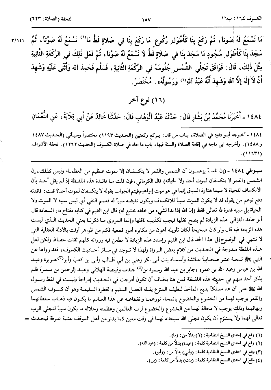 نَوْعٌ آخَرُ 1484 - أَخْبَرَنَا مُحَمَّدُ بْنُ بَشَّارٍ قَالَ حَدَّثَنَا عَبْدُ الْوَهَّابِ قَالَ حَدَّثَنَا خَالِدٌ عَنْ أَبِي قِلَابَةَ عَنْ النُّعْمَانِ بْنِ بَشِيرٍ قَالَ انْكَسَفَتْ الشَّمْسُ عَلَى عَهْدِ رَسُولِ اللَّهِ صَلَّى اللَّهُ عَلَيْهِ وَسَلَّمَ فَخَرَجَ يَجُرُّ ثَوْبَهُ فَزِعًا حَتَّى أَتَى الْمَسْجِدَ فَلَمْ يَزَلْ يُصَلِّي بِنَا حَتَّى انْجَلَتْ فَلَمَّا انْجَلَتْ قَالَ إِنَّ نَاسًا يَزْعُمُونَ أَنَّ الشَّمْسَ وَالْقَمَرَ لَا يَنْكَسِفَانِ إِلَّا لِمَوْتِ عَظِيمٍ مِنْ الْعُظَمَاءِ وَلَيْسَ كَذَلِكَ إِنَّ الشَّمْسَ وَالْقَمَرَ لَا يَنْكَسِفَانِ لِمَوْتِ أَحَدٍ وَلَا لِحَيَاتِهِ وَلَكِنَّهُمَا آيَتَانِ مِنْ آيَاتِ اللَّهِ عَزَّ وَجَلَّ إِنَّ اللَّهَ عَزَّ وَجَلَّ إِذَا بَدَا لِشَيْءٍ مِنْ خَلْقِهِ خَشَعَ لَهُ فَإِذَا رَأَيْتُمْ ذَلِكَ فَصَلُّوا كَأَحْدَثِ صَلَاةٍ صَلَّيْتُمُوهَا مِنْ الْمَكْتُوبَةِ
