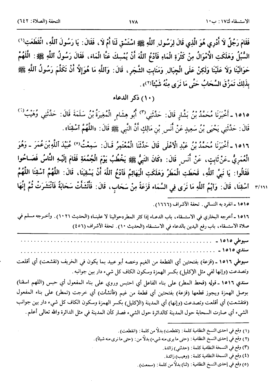 1516 - أَخْبَرَنَا مُحَمَّدُ بْنُ عَبْدِ الْأَعْلَى قَالَ حَدَّثَنَا الْمُعْتَمِرُ قَالَ سَمِعْتُ عُبَيْدَ اللَّهِ بْنَ عُمَرَ وَهُوَ الْعُمَرِيُّ عَنْ ثَابِتٍ عَنْ أَنَسٍ قَالَ كَانَ النَّبِيُّ صَلَّى اللَّهُ عَلَيْهِ وَسَلَّمَ يَخْطُبُ يَوْمَ الْجُمُعَةِ فَقَامَ إِلَيْهِ النَّاسُ فَصَاحُوا فَقَالُوا يَا نَبِيَّ اللَّهِ قَحَطَتْ الْمَطَرُ وَهَلَكَتْ الْبَهَائِمُ فَادْعُ اللَّهَ أَنْ يَسْقِيَنَا قَالَ اللَّهُمَّ اسْقِنَا اللَّهُمَّ اسْقِنَا قَالَ وَايْمُ اللَّهِ مَا نَرَى فِي السَّمَاءِ قَزَعَةً مِنْ سَحَابٍ قَالَ فَأَنْشَأَتْ سَحَابَةٌ فَانْتَشَرَتْ ثُمَّ إِنَّهَا أُمْطِرَتْ وَنَزَلَ رَسُولُ اللَّهِ صَلَّى اللَّهُ عَلَيْهِ وَسَلَّمَ فَصَلَّى وَانْصَرَفَ النَّاسُ فَلَمْ تَزَلْ تَمْطُرُ إِلَى يَوْمِ الْجُمُعَةِ الْأُخْرَى فَلَمَّا قَامَ رَسُولُ اللَّهِ صَلَّى اللَّهُ عَلَيْهِ وَسَلَّمَ يَخْطُبُ صَاحُوا إِلَيْهِ فَقَالُوا يَا نَبِيَّ اللَّهِ تَهَدَّمَتْ الْبُيُوتُ وَتَقَطَّعَتْ السُّبُلُ فَادْعُ اللَّهَ أَنْ يَحْبِسَهَا عَنَّا فَتَبَسَّمَ رَسُولُ اللَّهِ صَلَّى اللَّهُ عَلَيْهِ وَسَلَّمَ وَقَالَ اللَّهُمَّ حَوَالَيْنَا وَلَا عَلَيْنَا فَتَقَشَّعَتْ عَنْ الْمَدِينَةِ فَجَعَلَتْ تَمْطُرُ حَوْلَهَا وَمَا تَمْطُرُ بِالْمَدِينَةِ قَطْرَةً فَنَظَرْتُ إِلَى الْمَدِينَةِ وَإِنَّهَا لَفِي مِثْلِ الْإِكْلِيلِ