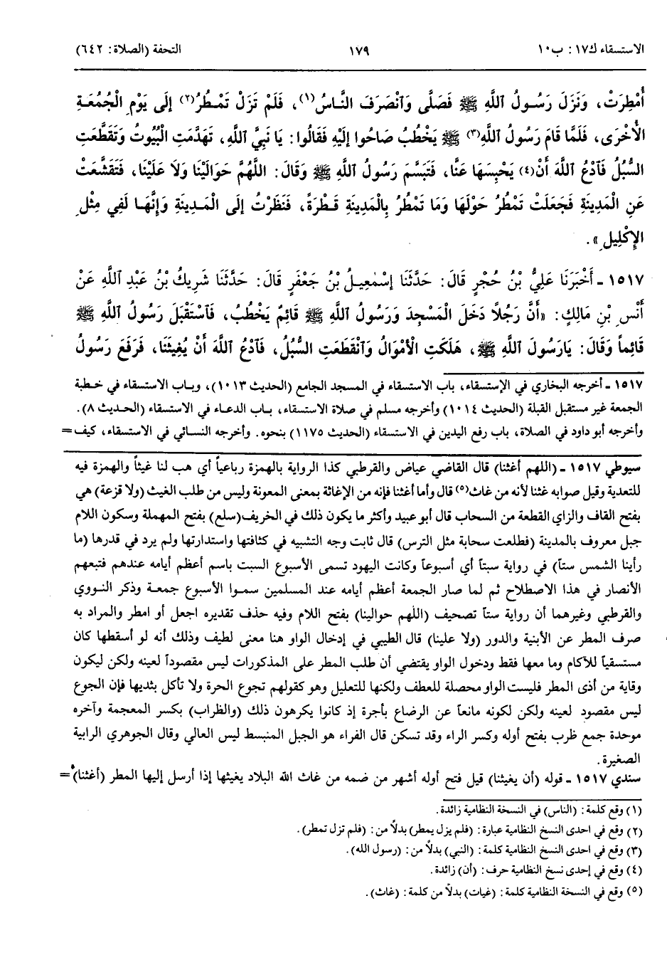 1517 - أَخْبَرَنَا عَلِيُّ بْنُ حُجْرٍ قَالَ حَدَّثَنَا إِسْمَعِيلُ بْنُ جَعْفَرٍ قَالَ حَدَّثَنَا شَرِيكُ بْنُ عَبْدِ اللَّهِ عَنْ أَنَسِ بْنِ مَالِكٍ أَنَّ رَجُلًا دَخَلَ الْمَسْجِدَ وَرَسُولُ اللَّهِ صَلَّى اللَّهُ عَلَيْهِ وَسَلَّمَ قَائِمٌ يَخْطُبُ فَاسْتَقْبَلَ رَسُولَ اللَّهِ صَلَّى اللَّهُ عَلَيْهِ وَسَلَّمَ قَائِمًا وَقَالَ يَا رَسُولَ اللَّهِ هَلَكَتْ الْأَمْوَالُ وَانْقَطَعَتْ السُّبُلُ فَادْعُ اللَّهَ أَنْ يُغِيثَنَا فَرَفَعَ رَسُولُ اللَّهِ صَلَّى اللَّهُ عَلَيْهِ وَسَلَّمَ يَدَيْهِ ثُمَّ قَالَ اللَّهُمَّ أَغِثْنَا اللَّهُمَّ أَغِثْنَا قَالَ أَنَسٌ وَلَا وَاللَّهِ مَا نَرَى فِي السَّمَاءِ مِنْ سَحَابَةٍ وَلَا قَزَعَةٍ وَمَا بَيْنَنَا وَبَيْنَ سَلْعٍ مِنْ بَيْتٍ وَلَا دَارٍ فَطَلَعَتْ سَحَابَةٌ مِثْلُ التُّرْسِ فَلَمَّا تَوَسَّطَتْ السَّمَاءَ انْتَشَرَتْ وَأَمْطَرَتْ قَالَ أَنَسٌ وَلَا وَاللَّهِ مَا رَأَيْنَا الشَّمْسَ سَبْتًا قَالَ ثُمَّ دَخَلَ رَجُلٌ مِنْ ذَلِكَ الْبَابِ فِي الْجُمُعَةِ الْمُقْبِلَةِ وَرَسُولُ اللَّهِ صَلَّى اللَّهُ عَلَيْهِ وَسَلَّمَ قَائِمٌ يَخْطُبُ فَاسْتَقْبَلَهُ قَائِمًا فَقَالَ يَا رَسُولَ اللَّهِ صَلَّى اللَّهُ وَسَلَّمَ عَلَيْكَ هَلَكَتْ الْأَمْوَالُ وَانْقَطَعَتْ السُّبُلُ فَادْعُ اللَّهَ أَنْ يُمْسِكَهَا عَنَّا فَرَفَعَ رَسُولُ اللَّهِ صَلَّى اللَّهُ عَلَيْهِ وَسَلَّمَ يَدَيْهِ فَقَالَ اللَّهُمَّ حَوَالَيْنَا وَلَا عَلَيْنَا اللَّهُمَّ عَلَى الْآكَامِ وَالظِّرَابِ وَبُطُونِ الْأَوْدِيَةِ وَمَنَابِتِ الشَّجَرِ قَالَ فَأَقْلَعَتْ وَخَرَجْنَا نَمْشِي فِي الشَّمْسِ قَالَ شَرِيكٌ سَأَلْتُ أَنَسًا أَهُوَ الرَّجُلُ الْأَوَّلُ قَالَ لَا