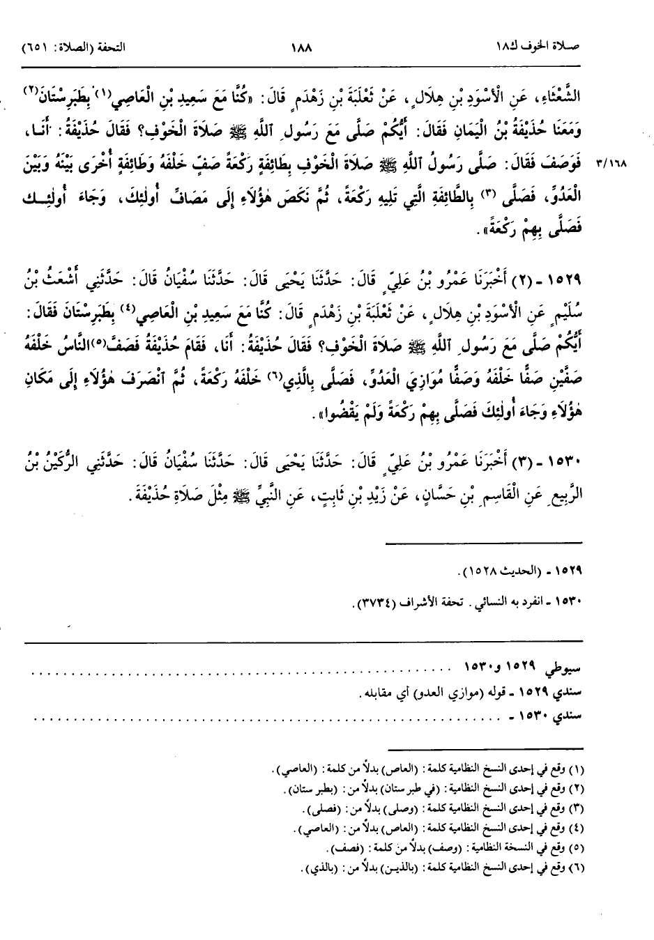 1529 - أَخْبَرَنَا عَمْرُو بْنُ عَلِيٍّ قَالَ حَدَّثَنَا يَحْيَى قَالَ حَدَّثَنَا سُفْيَانُ قَالَ حَدَّثَنِي أَشْعَثُ بْنُ سُلَيْمٍ عَنْ الْأَسْوَدِ بْنِ هِلَالٍ عَنْ ثَعْلَبَةَ بْنِ زَهْدَمٍ قَالَ كُنَّا مَعَ سَعِيدِ بْنِ الْعَاصِي بِطَبَرِسْتَانَ فَقَالَ أَيُّكُمْ صَلَّى مَعَ رَسُولِ اللَّهِ صَلَّى اللَّهُ عَلَيْهِ وَسَلَّمَ صَلَاةَ الْخَوْفِ فَقَالَ حُذَيْفَةُ أَنَا فَقَامَ حُذَيْفَةُ فَصَفَّ النَّاسُ خَلْفَهُ صَفَّيْنِ صَفًّا خَلْفَهُ وَصَفًّا مُوَازِيَ الْعَدُوِّ فَصَلَّى بِالَّذِي خَلْفَهُ رَكْعَةً ثُمَّ انْصَرَفَ هَؤُلَاءِ إِلَى مَكَانِ هَؤُلَاءِ وَجَاءَ أُولَئِكَ فَصَلَّى بِهِمْ رَكْعَةً وَلَمْ يَقْضُوا أَخْبَرَنَا عَمْرُو بْنُ عَلِيٍّ قَالَ حَدَّثَنَا يَحْيَى قَالَ حَدَّثَنَا سُفْيَانُ قَالَ حَدَّثَنِي الرُّكَيْنُ بْنُ الرَّبِيعِ عَنْ الْقَاسِمِ بْنِ حَسَّانَ عَنْ زَيْدِ بْنِ ثَابِتٍ عَنْ النَّبِيِّ صَلَّى اللَّهُ عَلَيْهِ وَسَلَّمَ مِثْلَ صَلَاةِ حُذَيْفَةَ